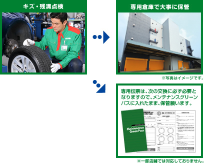 お客様からお預かりしたタイヤ・ホイールはタイヤ館が契約する専門の倉庫業者に委託し、専用倉庫で保管、もしくは、倉庫業免許を取得している自店倉庫できちんと保管いたします。 - お預かりするタイヤ・ホイールは、タイヤ館にて脱着作業したものに限らせていただきます。また、お持ち込みの場合は別途店舗にご相談ください。尚、脱着料金を別途申し受けます。