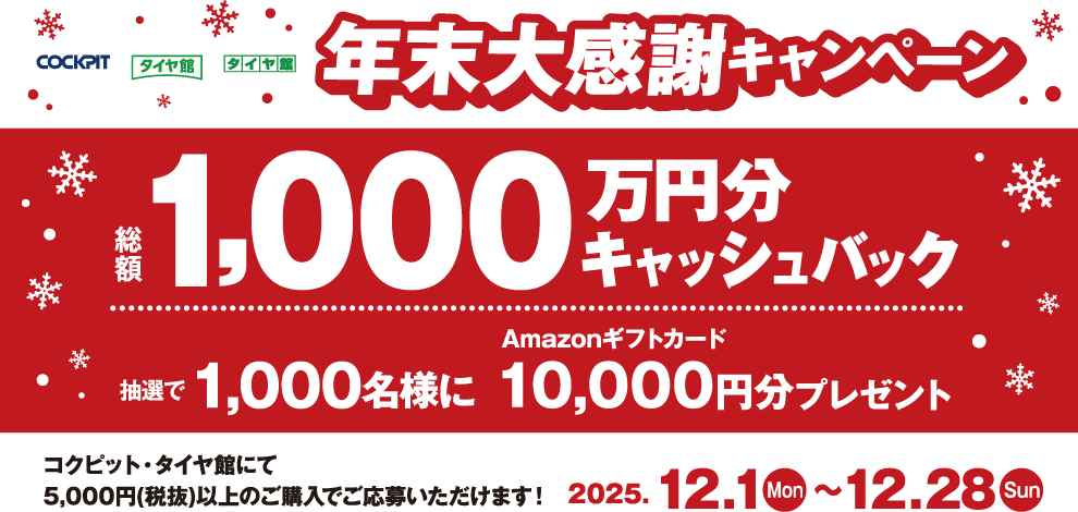 - タイヤクーポンは、2025年12月4日(木)に、コクピット・タイヤ館アプリ上で配布を予定しております。