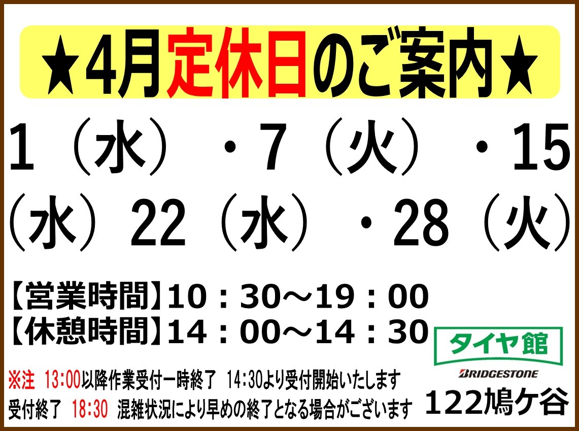 ☆ 4月定休日のご案内 ☆ 2026年3月30日 タイヤ館122鳩ヶ谷店のホームページを ご覧いただきありがとうございます。 4月の定休日のご案内です。 ご不便とご迷惑をお掛け致しますが、 何卒よろしくお願いいたします。
