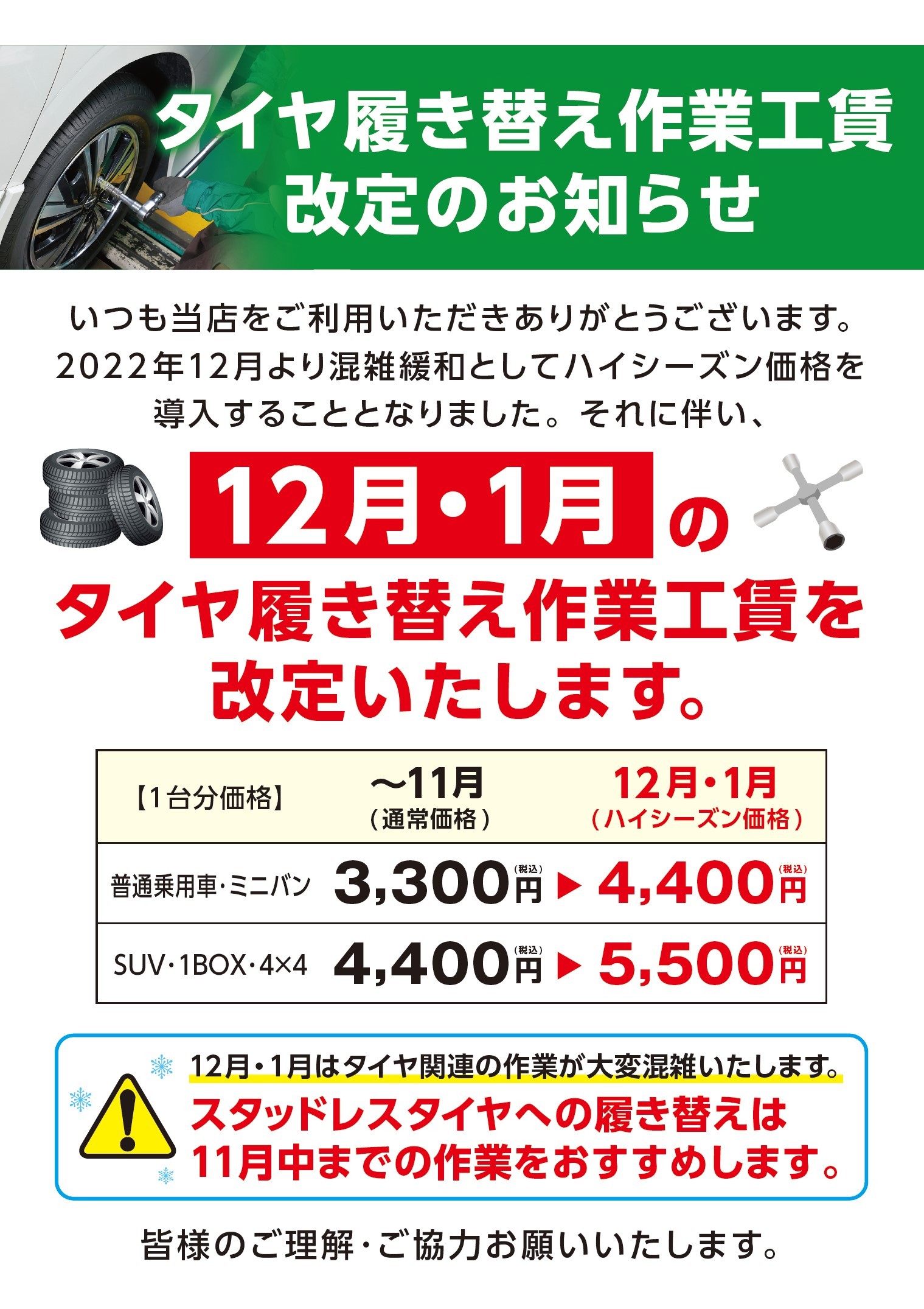 なお、昨年同様、「12月 1月」に関しましては「タイヤ履き替え工賃」が「ハイシーズン価格」に