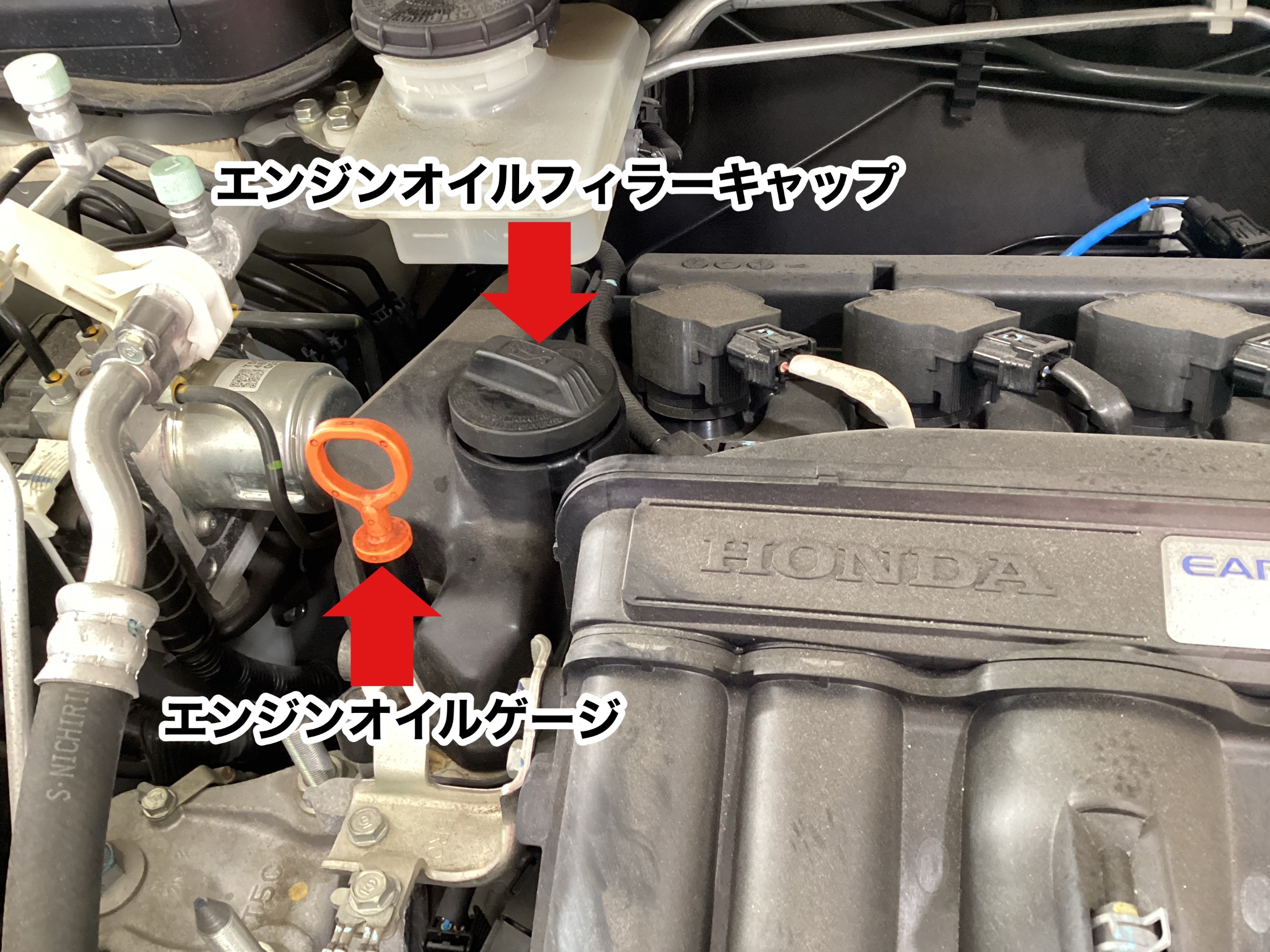 エンジンルームにあるフィラーキャップとレベルゲージを外し