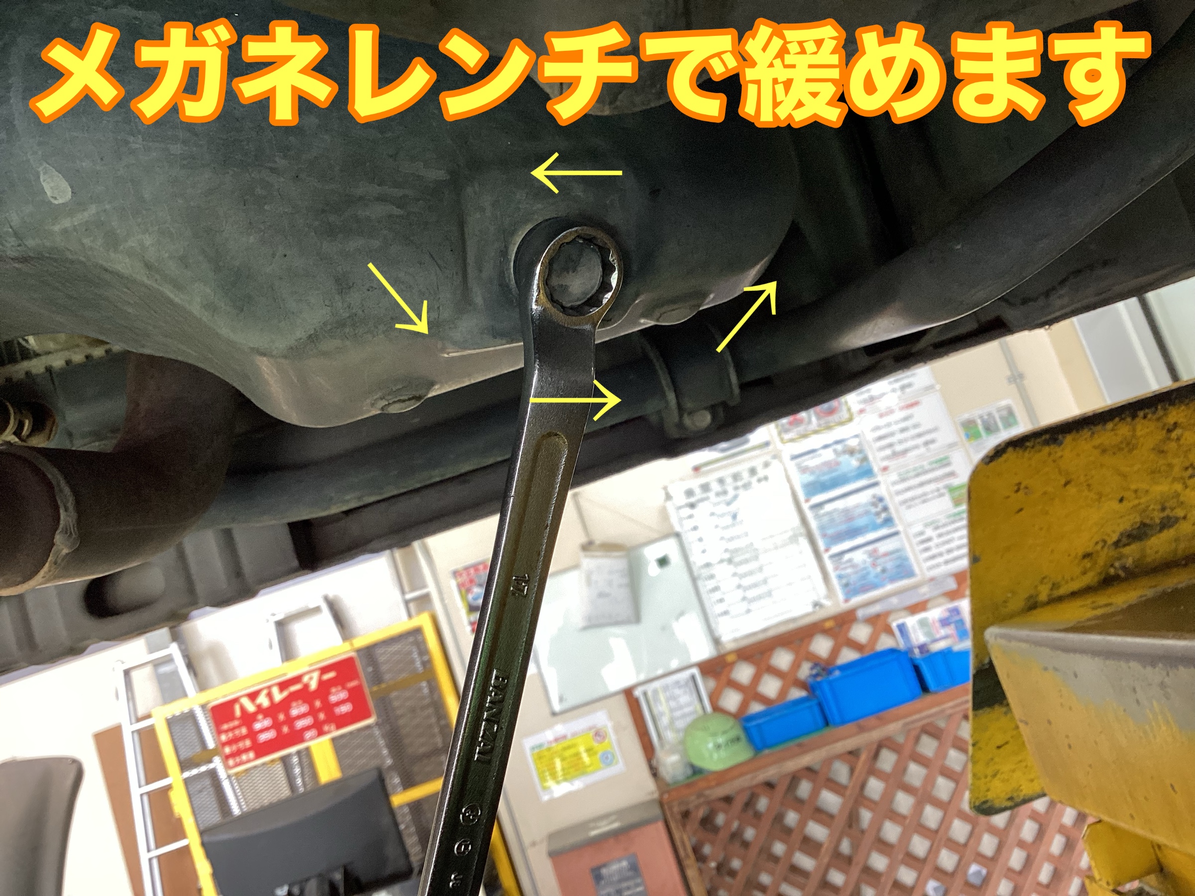メガネレンチで緩めてオイルが抜けたらパッキンを交換して締め付けます!