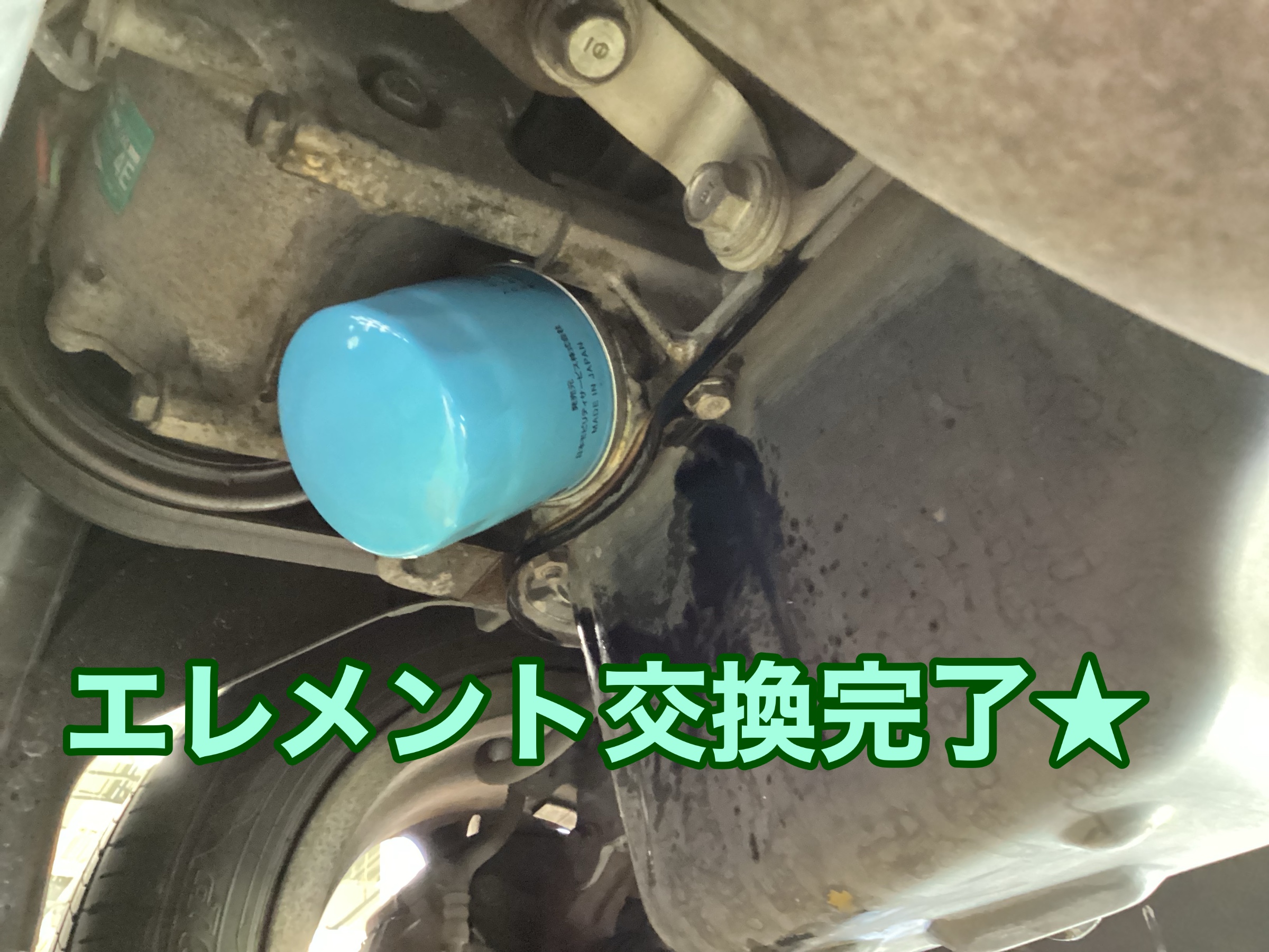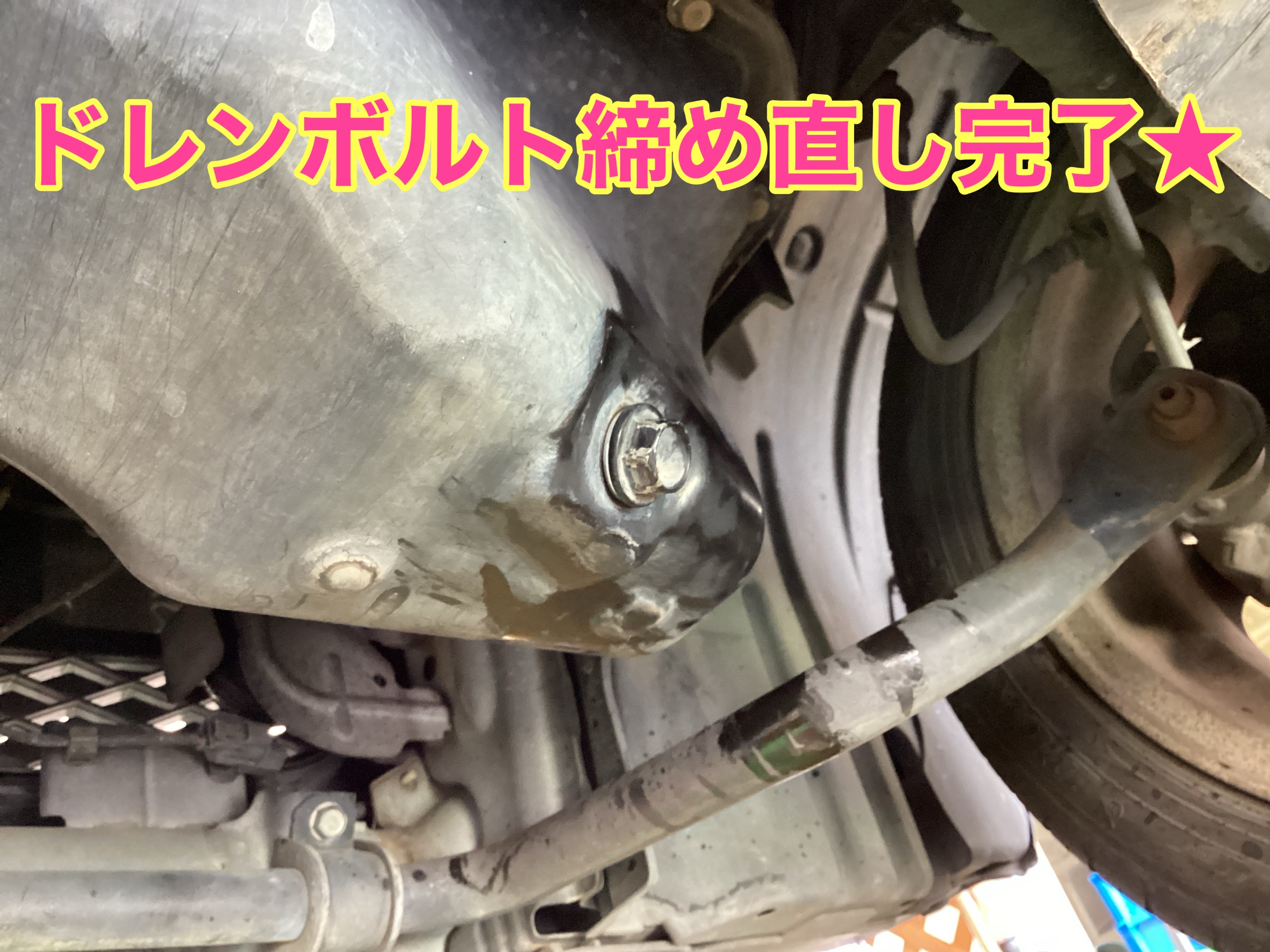 交換が完了したら、ドレンボルト、エレメント共にオイルを抜く際に周りについたオイル汚れを掃除して車体を下ろしていきます!