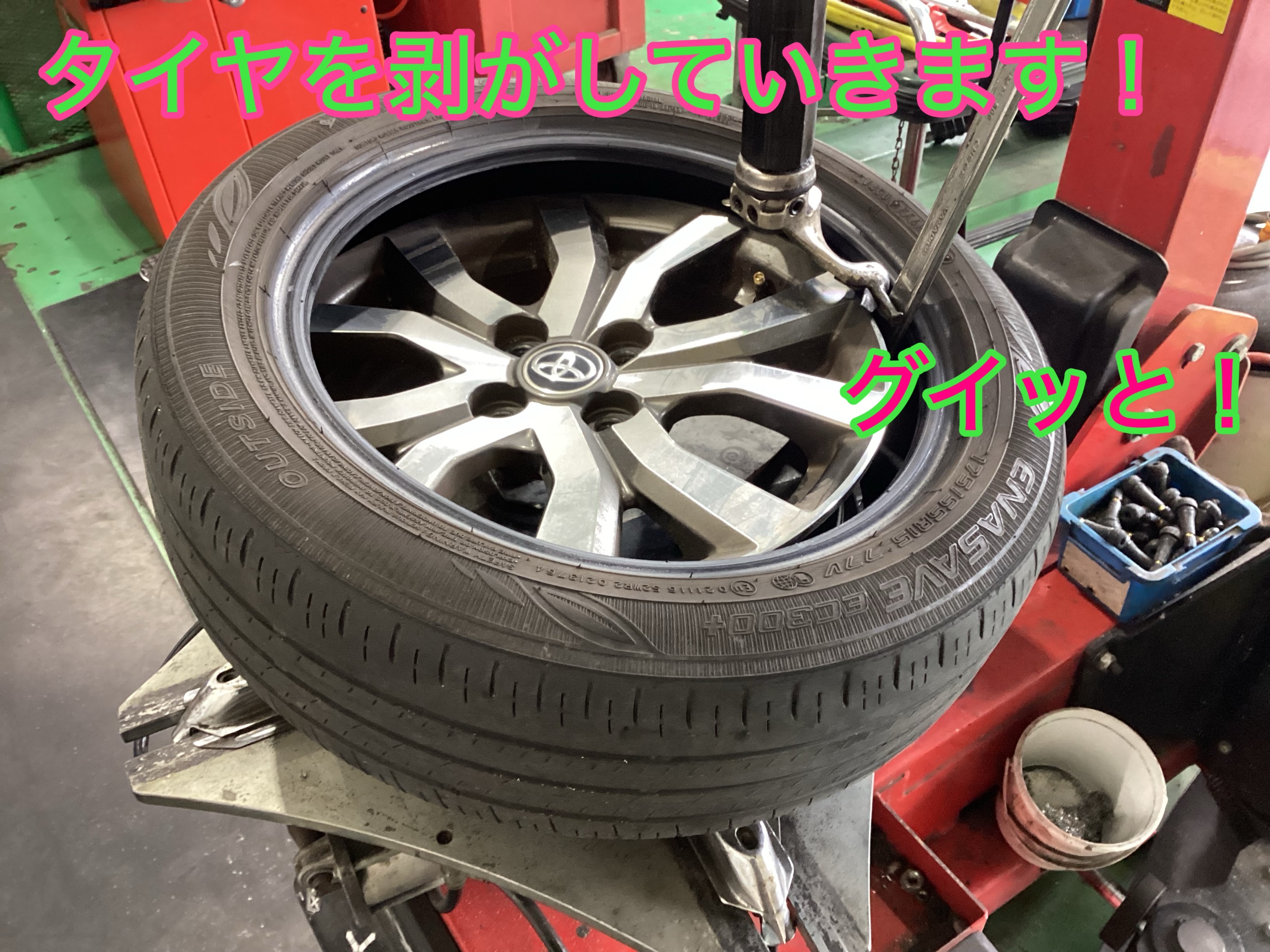 車をリフトアップして、タイヤを外し、タイヤチェンジャーにセットしたら作業スタート!
