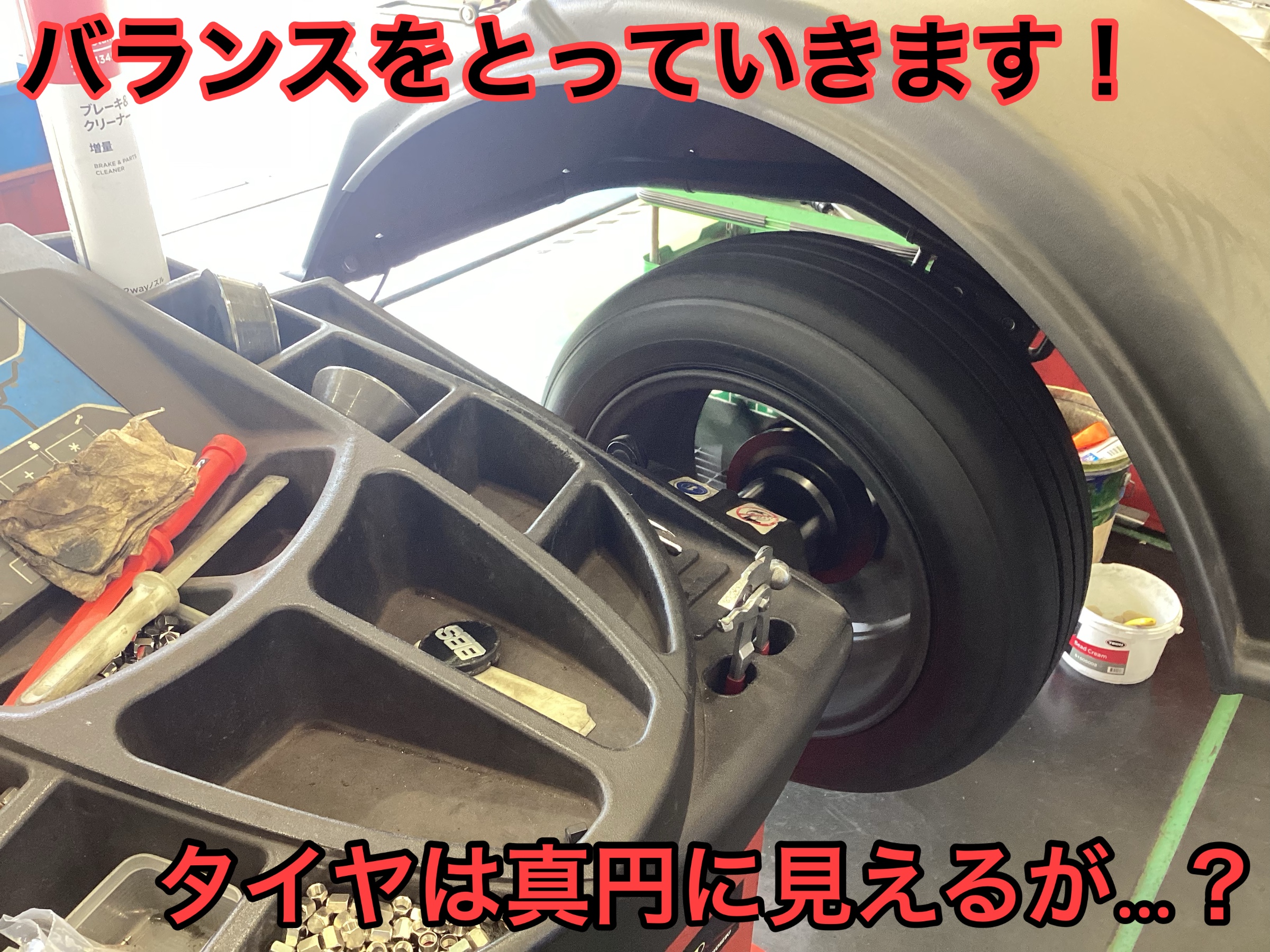 タイヤを組むだけでなく、バランスを取ることはとても重要で、タイヤは一見真円でバランスの良いように見えますが、ホイールとの噛み合わせやバルブ等の要因でバランスが乱れているものなのです!