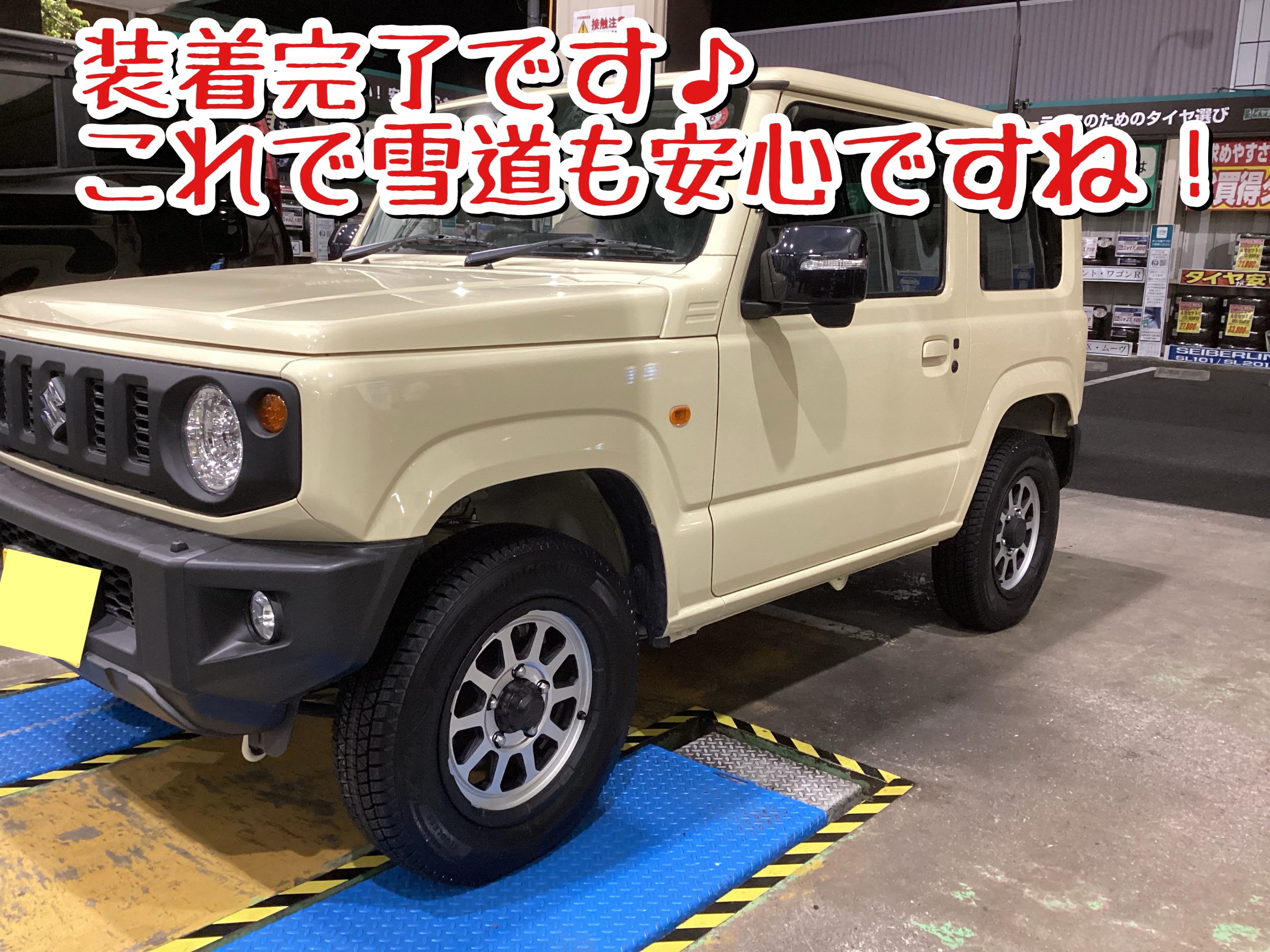 スズキ ジムニーにスタッドレスタイヤホイールセットの取付けです。