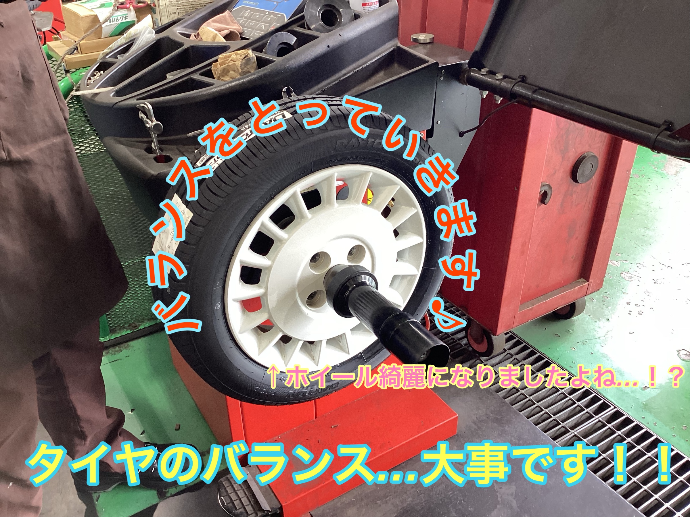 タイヤを組むだけでなく、バランスを取ることはとても重要で、タイヤは一見真円でバランスの良いように見えますが、ホイールとの噛み合わせやバルブ等の要因でバランスが乱れているものなのです!