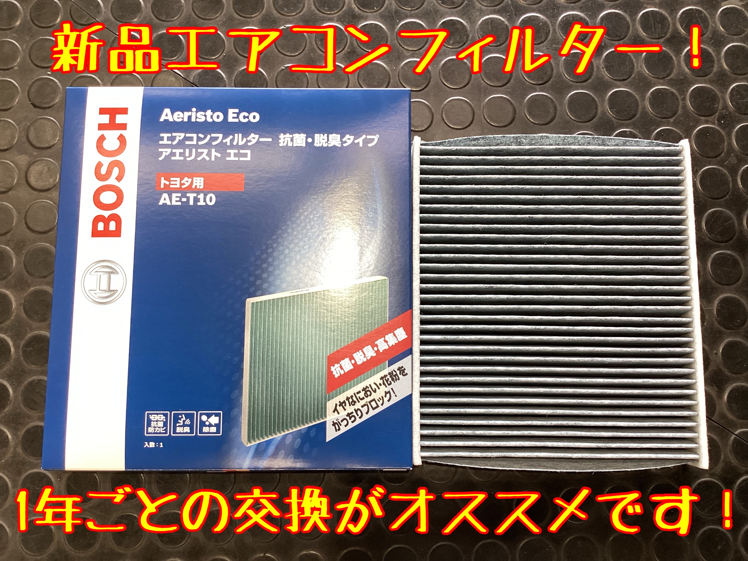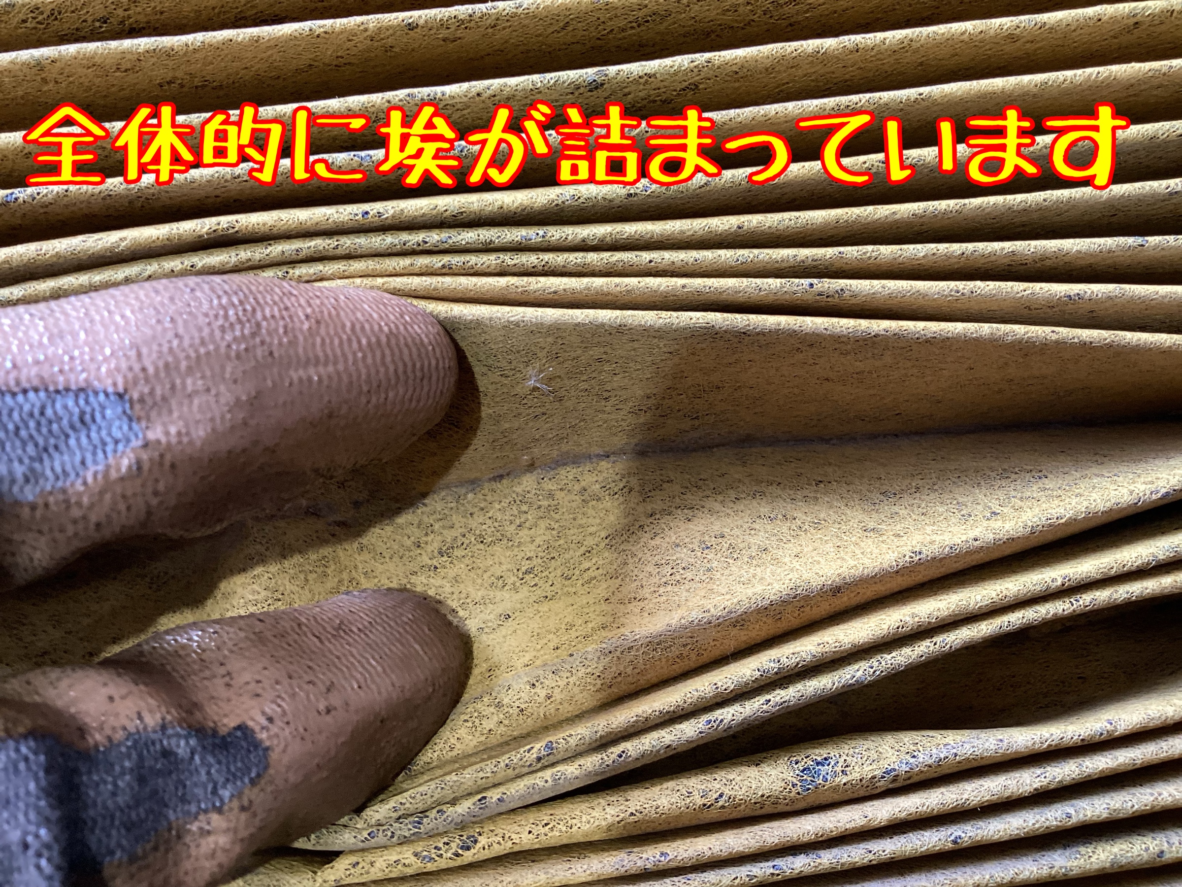 ↑新品のエアコンフィルターです。1年ごとの交換をオススメしています。