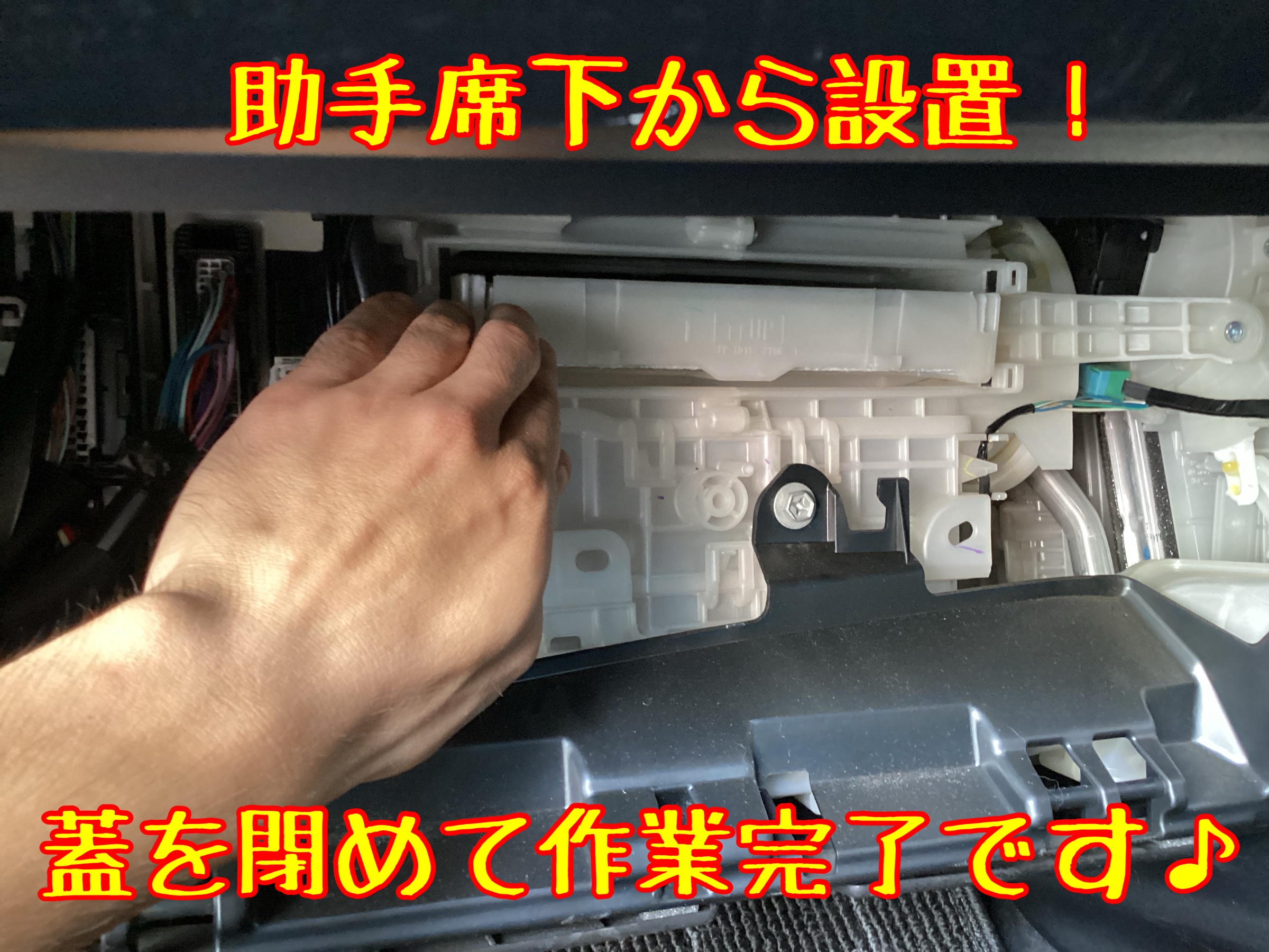 ↑助手席側グローブボックスの中から設置します。