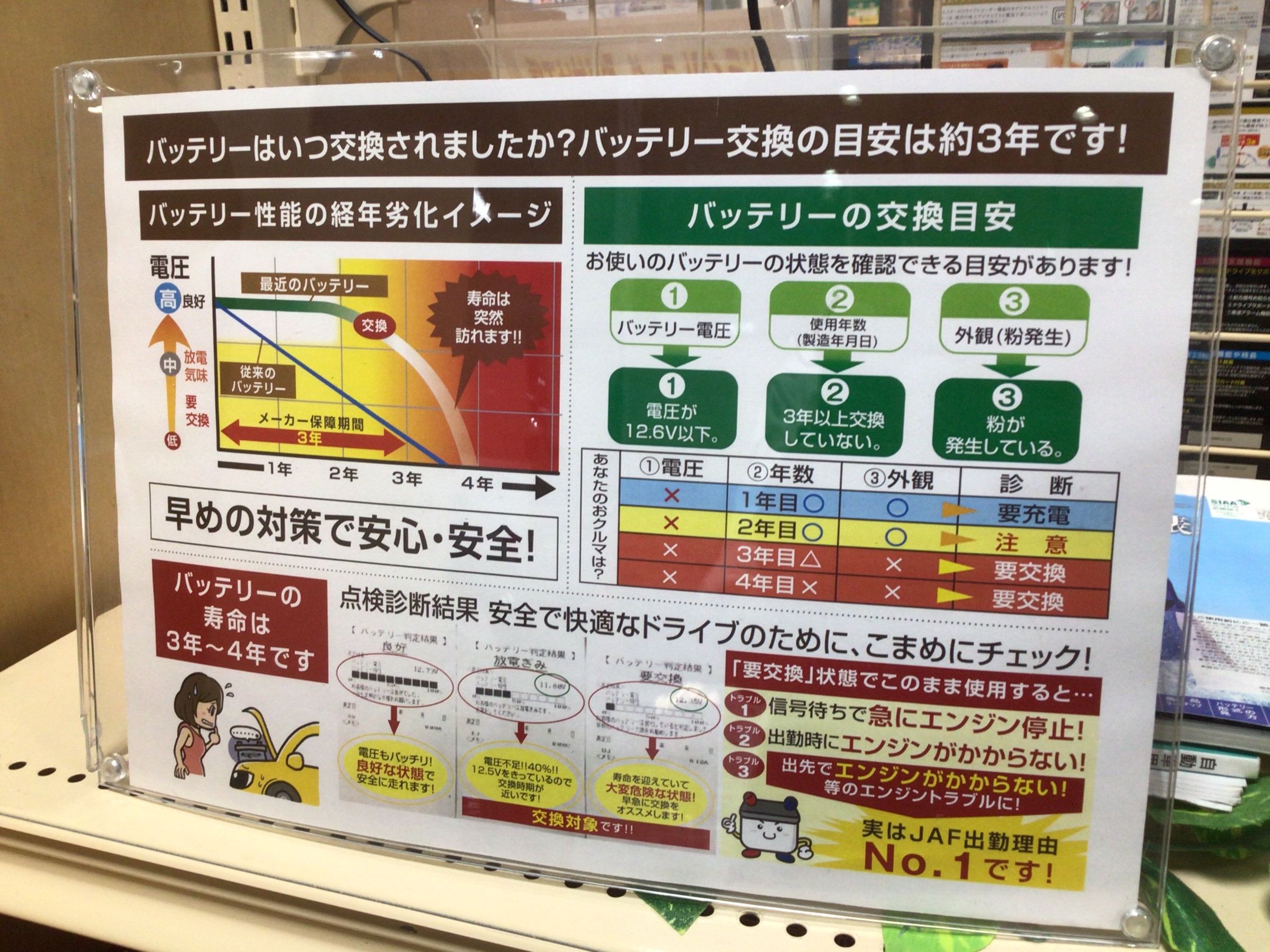 通常車両は3年前後、アイドリングストップ車は2年が交換の目安です。