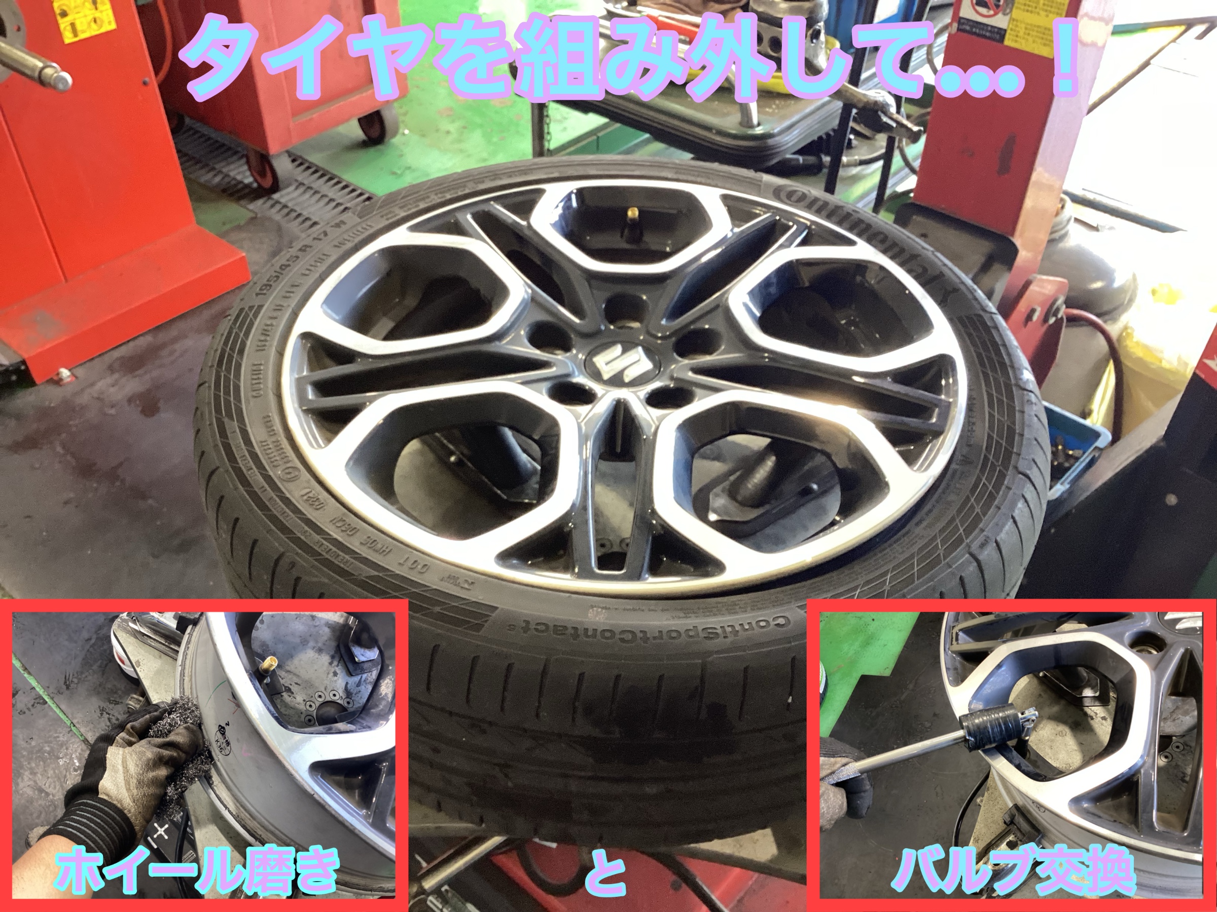 タイヤをホイールから組み外してホイール磨きとバルブ交換を行っていきます♪