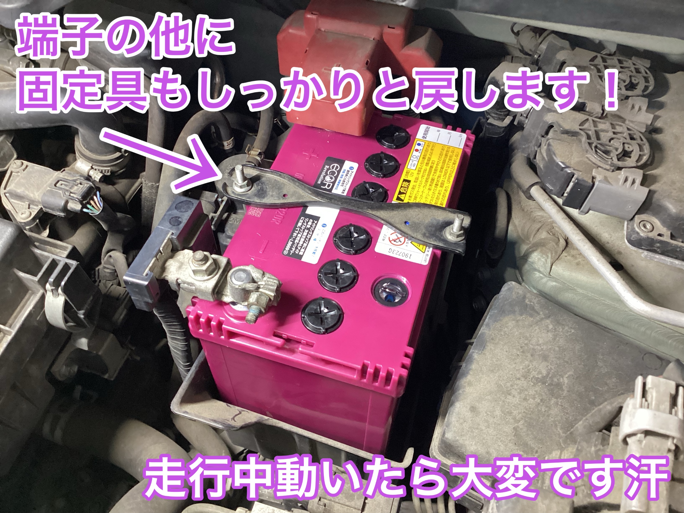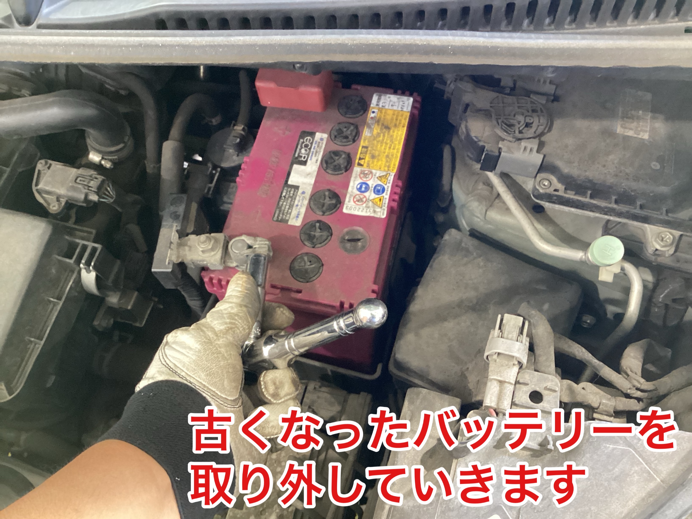 車とバッテリーを繋いでいる端子を外していくのですが…