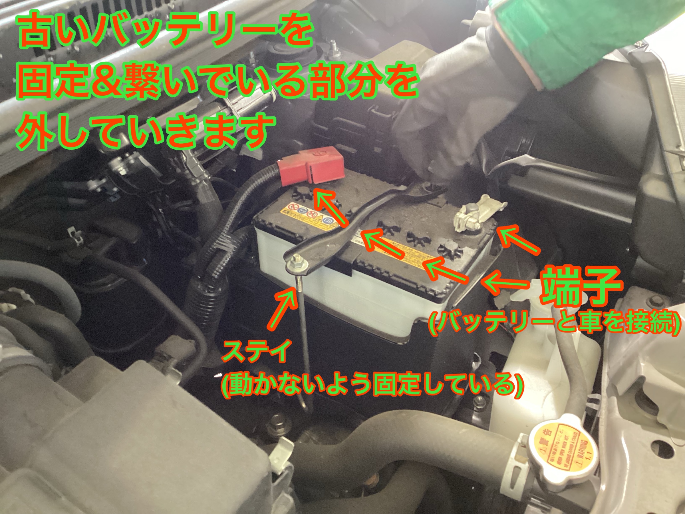 まずはバッテリーを固定&車に繋いでいる、ステイと端子を取り外していきます!