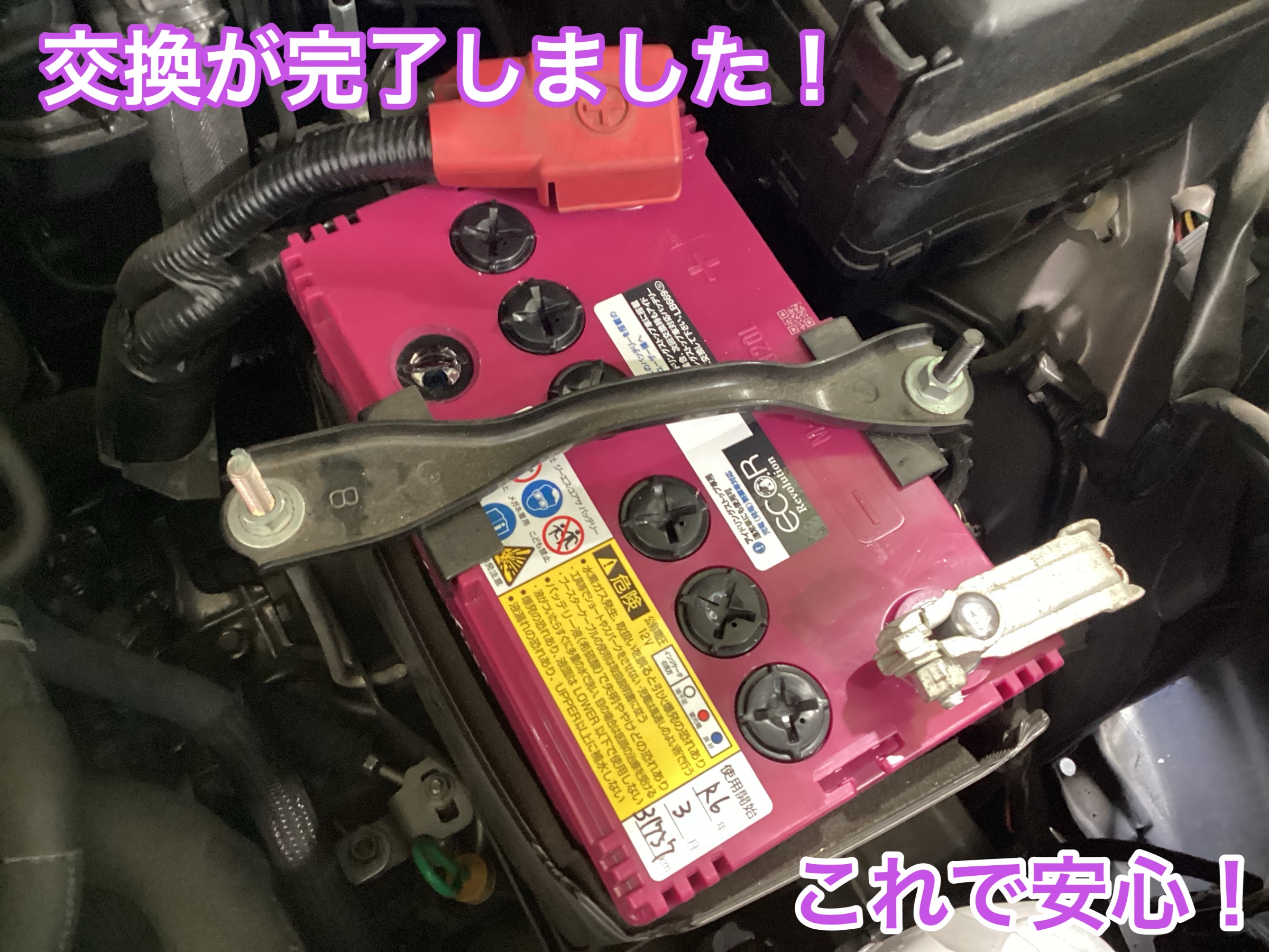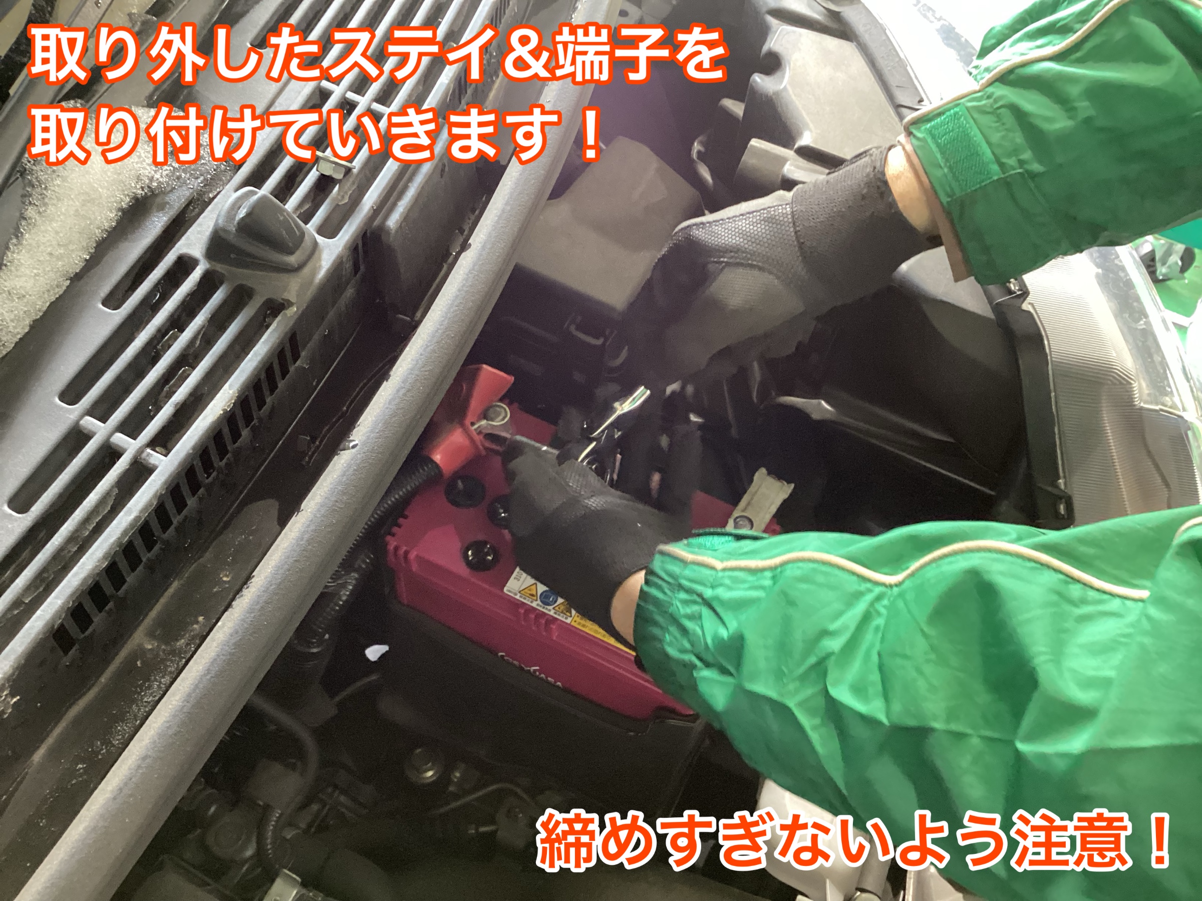 新しいバッテリーに入れ替えたら、先ほど外したステイ&端子を元に戻していきます!