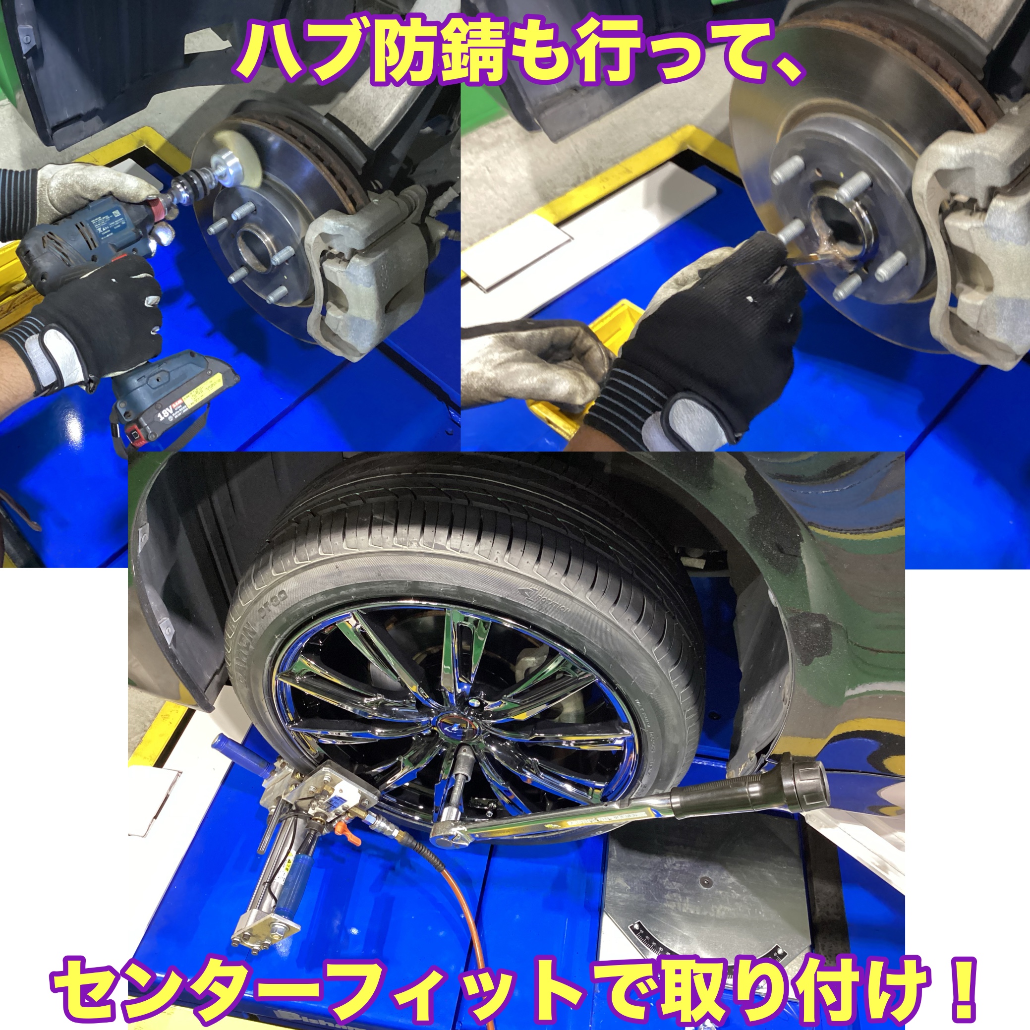 ホイールの取り付けと同時にタイヤ交換とハブの防錆施工、