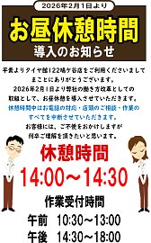 平素よりタイヤ館122鳩ケ谷店をご利用くださいまして誠にありがとうございます。 2026年2月1日より弊社の働き方改革としての取り組みとして、お昼休憩を導入させていただきます。 休憩時間中はお電話の対応・店頭のご相談・作業のすべてを中断させていただきます。 お客様には、ご不便をお掛け致し...