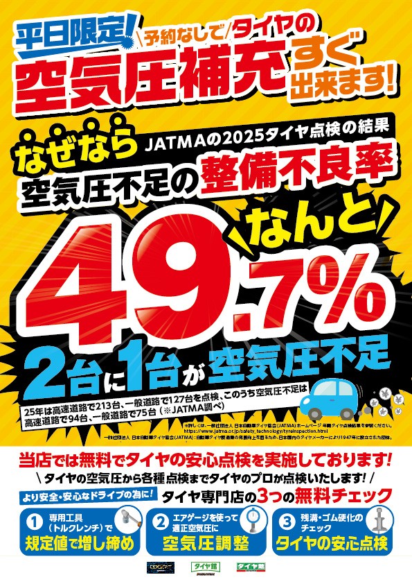 タイヤ空気圧点検 即日その場で無料にて点検いたします!!