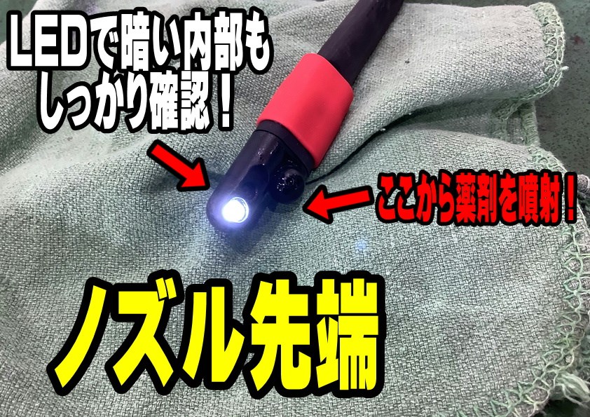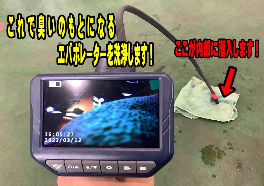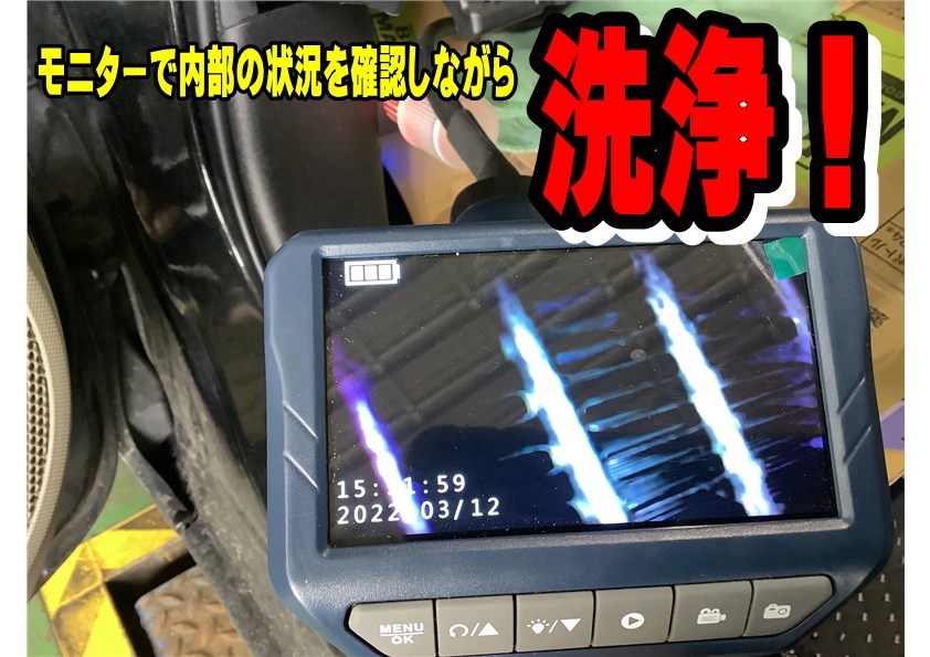 手の届かないエバポレーター部にノズルをいれて直接高圧噴射で