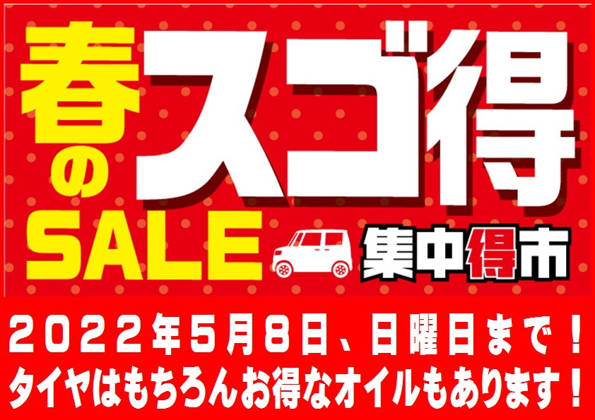 スゴ得セール開催中です! ポスト 2022年3月24日 こんにちは! 『タイヤ館275』です。 5月8日、日曜日まで 『春のスゴ得セール』開催中です! 夏・冬タイヤはもちろん お得なエンジンオイルなどもご用意してます! タイヤ交換とご一緒にエンジンオイル交換もいかがですか? 定期的なメンテナンスで、お車をながーく使いましょう! 皆様のご来店、お待ちしてマース!