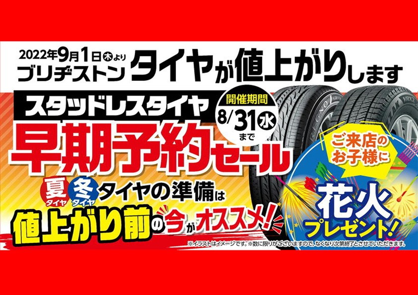 スタッドレスタイヤ早期予約セール!! ポスト 2022年8月19日 こんにちは! 東雁来の『タイヤ館275』です! 8/15から8/19まで夏季休業をさせて頂きましたが 本日より通常営業しております! ただ今当店では 『スタッドレスタイヤ早期予約セール』開催中です!! スタッドレスタイヤの購入は早目がお得!! 購入をお考えの方はぜひ『タイヤ館275』まで! 皆様のご来店お待ちしてマース!!