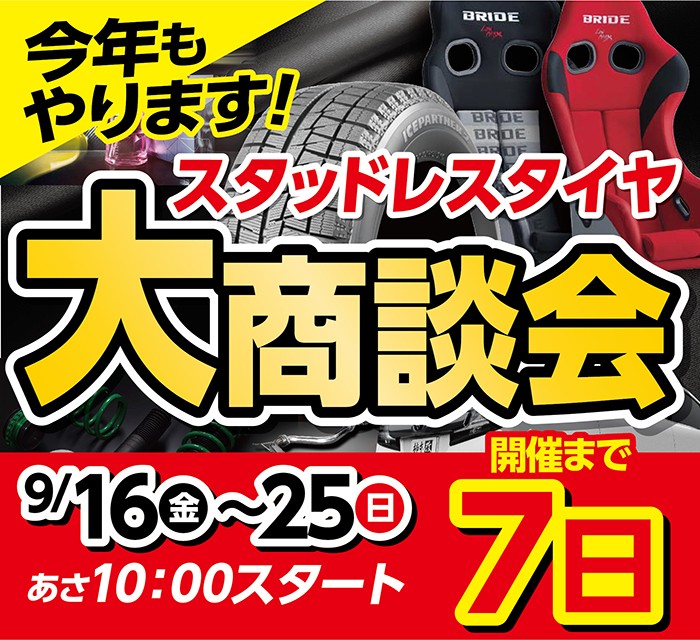 『スタッドレスタイヤ大商談会』!! ポスト 2022年9月9日 こんにちは! 東雁来の『タイヤ館275』です! お待たせしました! 今年も9月16日から 『スタッドレスタイヤ大商談会』開催いたします! 開催まであと7日!! ご購入を検討中の方はお見逃しなく!! 皆様のご来店お待ちしてマース!!