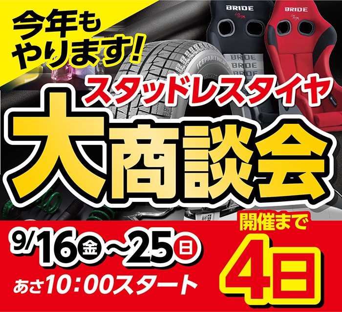 スタッドレスタイヤ大商談会 ポスト 2022年9月12日 こんにちは! 東雁来の『タイヤ館275』です! お待たせしました! 今年も9月16日から 『スタッドレスタイヤ大商談会』開催いたします! 開催まであと4日!! ご購入を検討中の方はお見逃しなく!! 皆様のご来店お待ちしてマース!