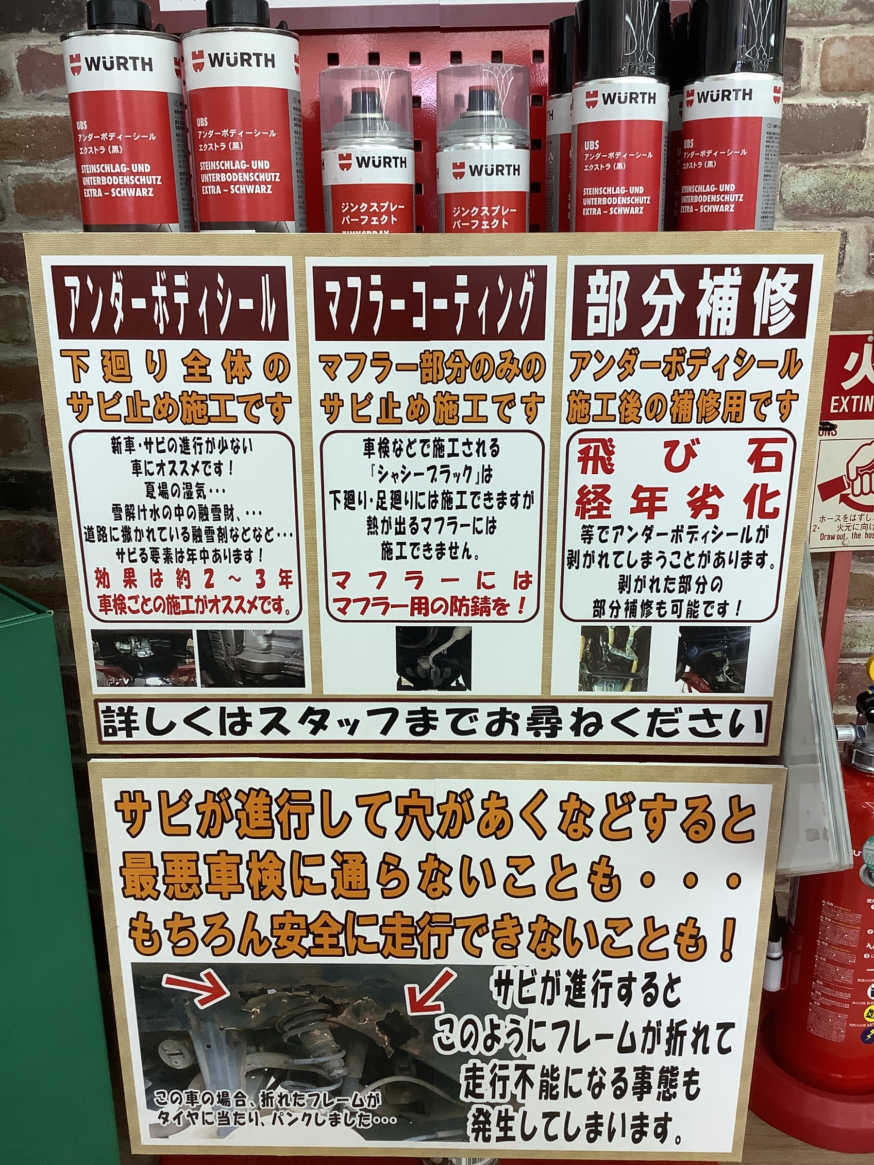 こんなこともやってます~ ポスト 2023年1月27日 こんにちは! 東雁来の『タイヤ館275』です。 噂の寒波も過ぎたようですが、まだまだ寒い日が続きますね~ 凍った道路に融雪剤が撒かれてますね~ お車の下回りの錆、気になっちゃいませんか? 実は『タイヤ館275』では お車の『下回りの錆止め』各種やってます! 気になる方はぜひ当店まで! 無料で点検も致します! 皆様のご来店、お待ちしてマース!