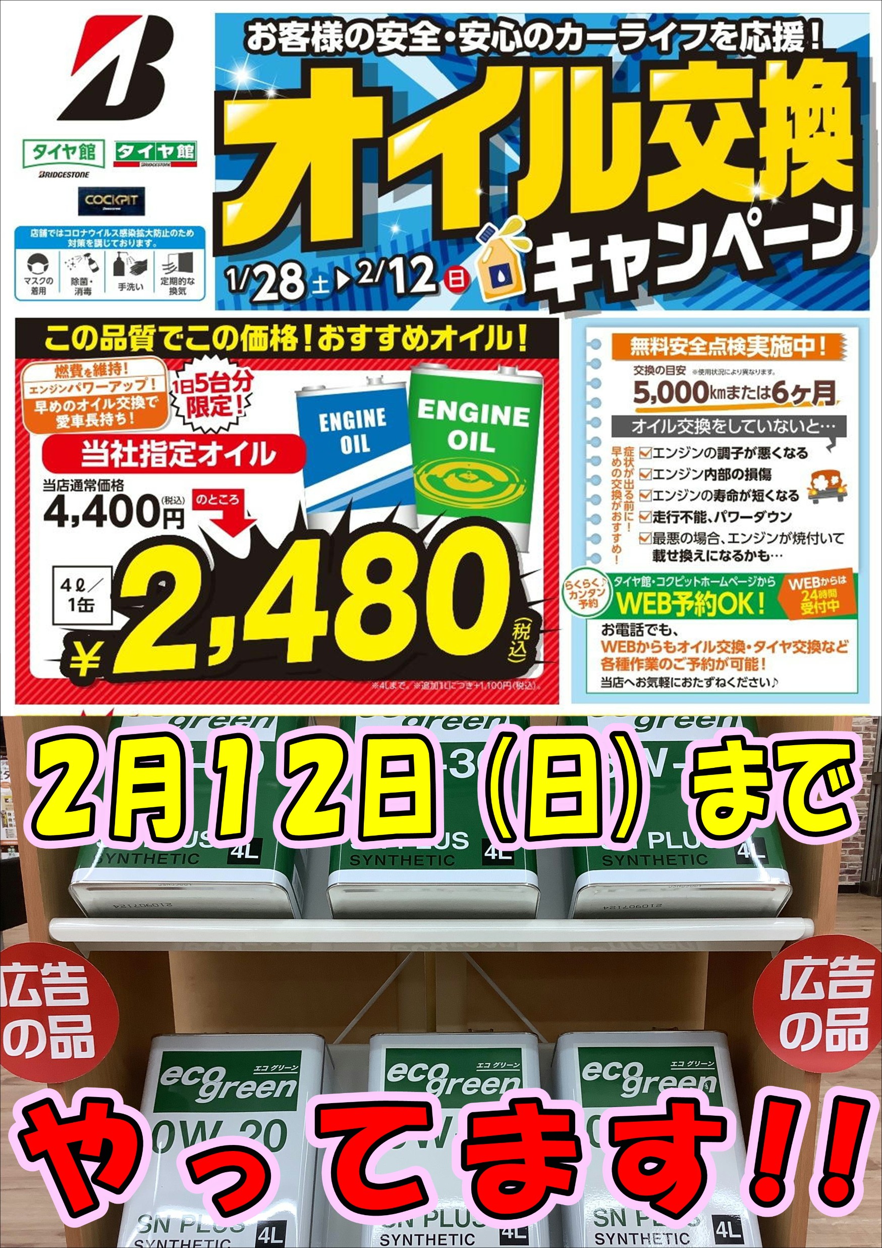 オイル交換キャンペーン、2月12日まで!! ポスト 2023年2月10日 こんいちは! 東雁来の『タイヤ館275』です。 皆さん、お車のエンジンオイル交換忘れていませんか? ただいま『タイヤ館275』では 『オイル交換キャンペーン』開催中です! 開催期間は2月12日・日曜日までとなっております! あとわずかですが、まだ間に合います! この機会をお見逃しなく! 皆様のご来店、お待ちしてマース!
