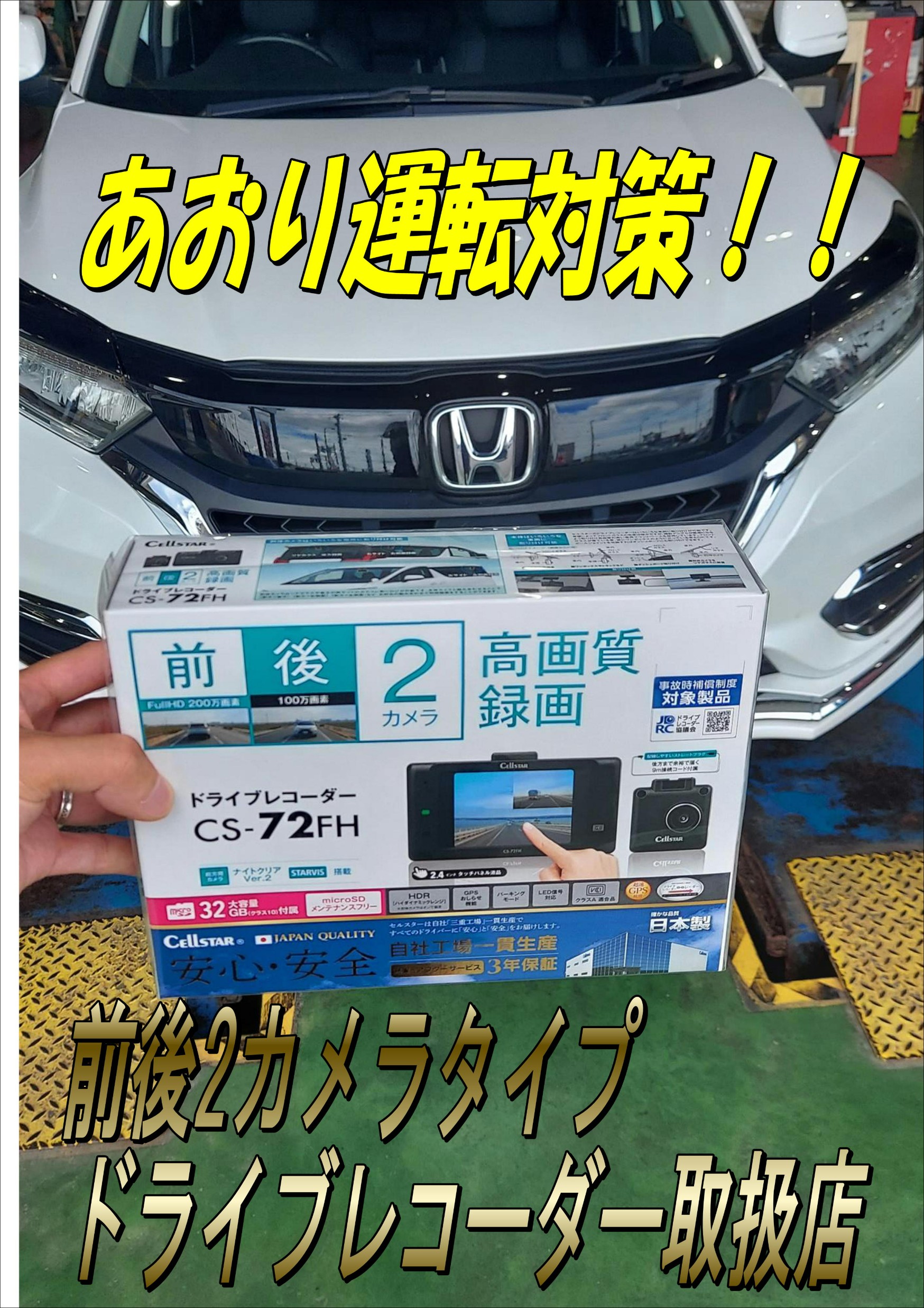 あおり運転対策!! ドライブレコーダーお取り付け セルスター前後2カメラタイプ
