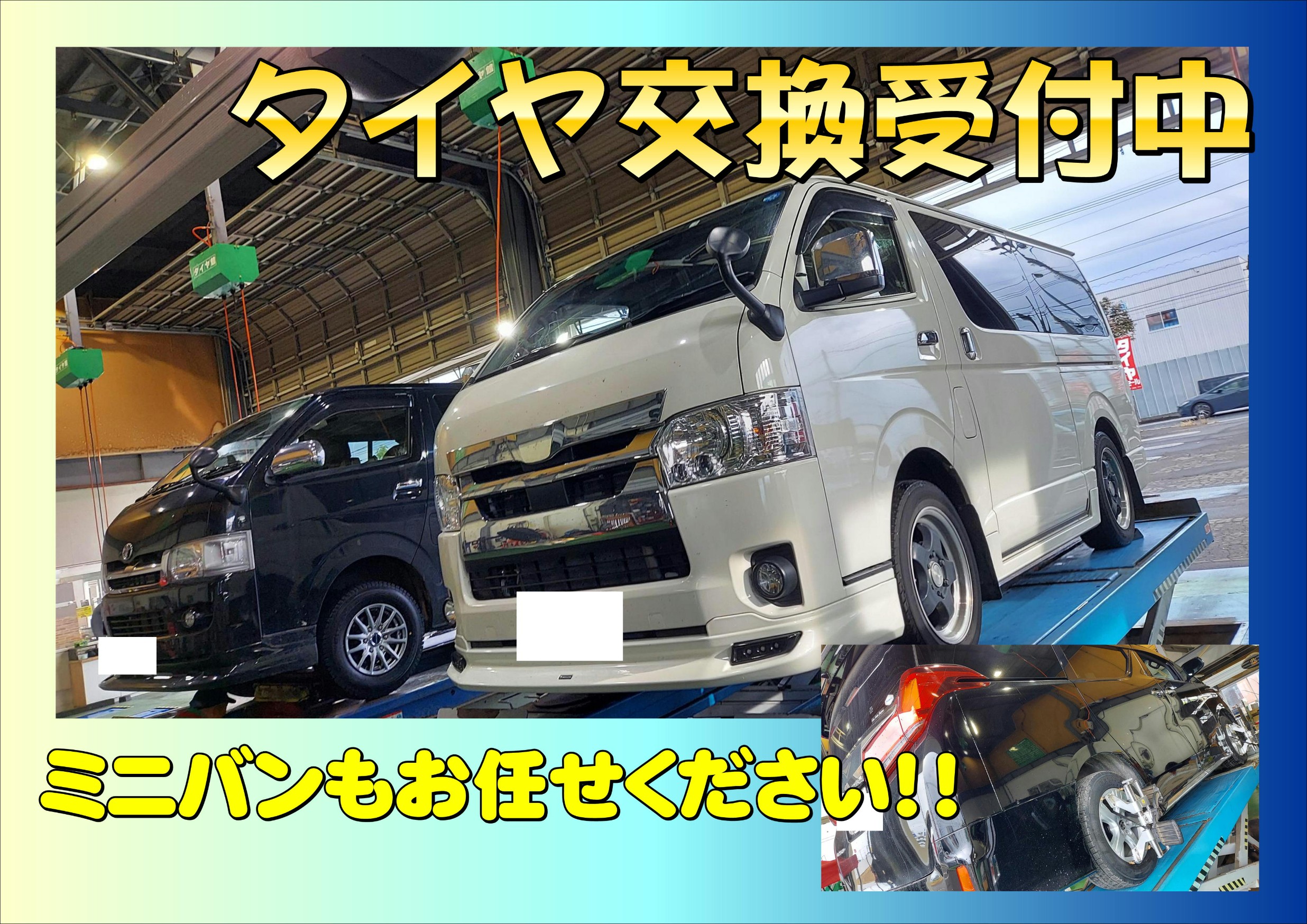 ミニバンタイヤ交換!? ハイエース アライメント専門店 スタッドレスタイヤ早期予約ファイナルセール残り2日
