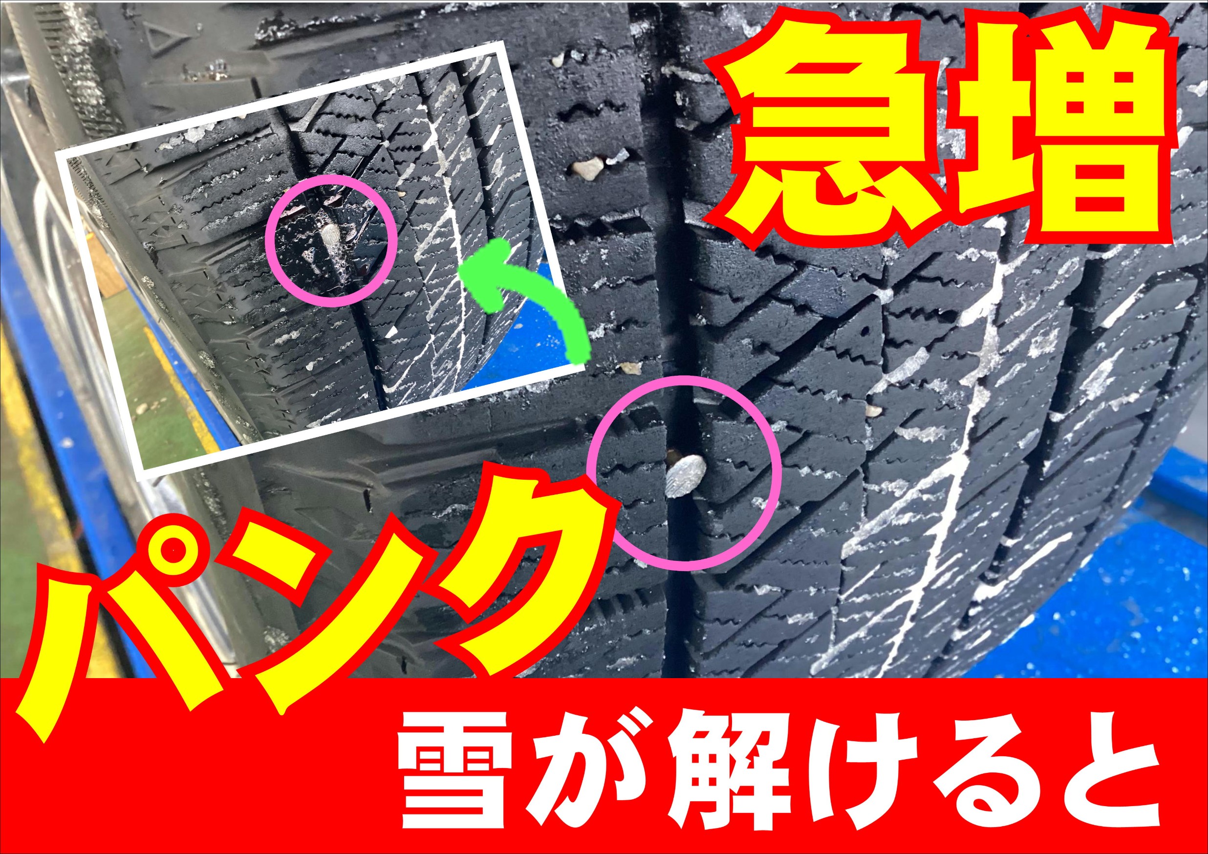 濡れたタイヤは釘など簡単に刺さります。