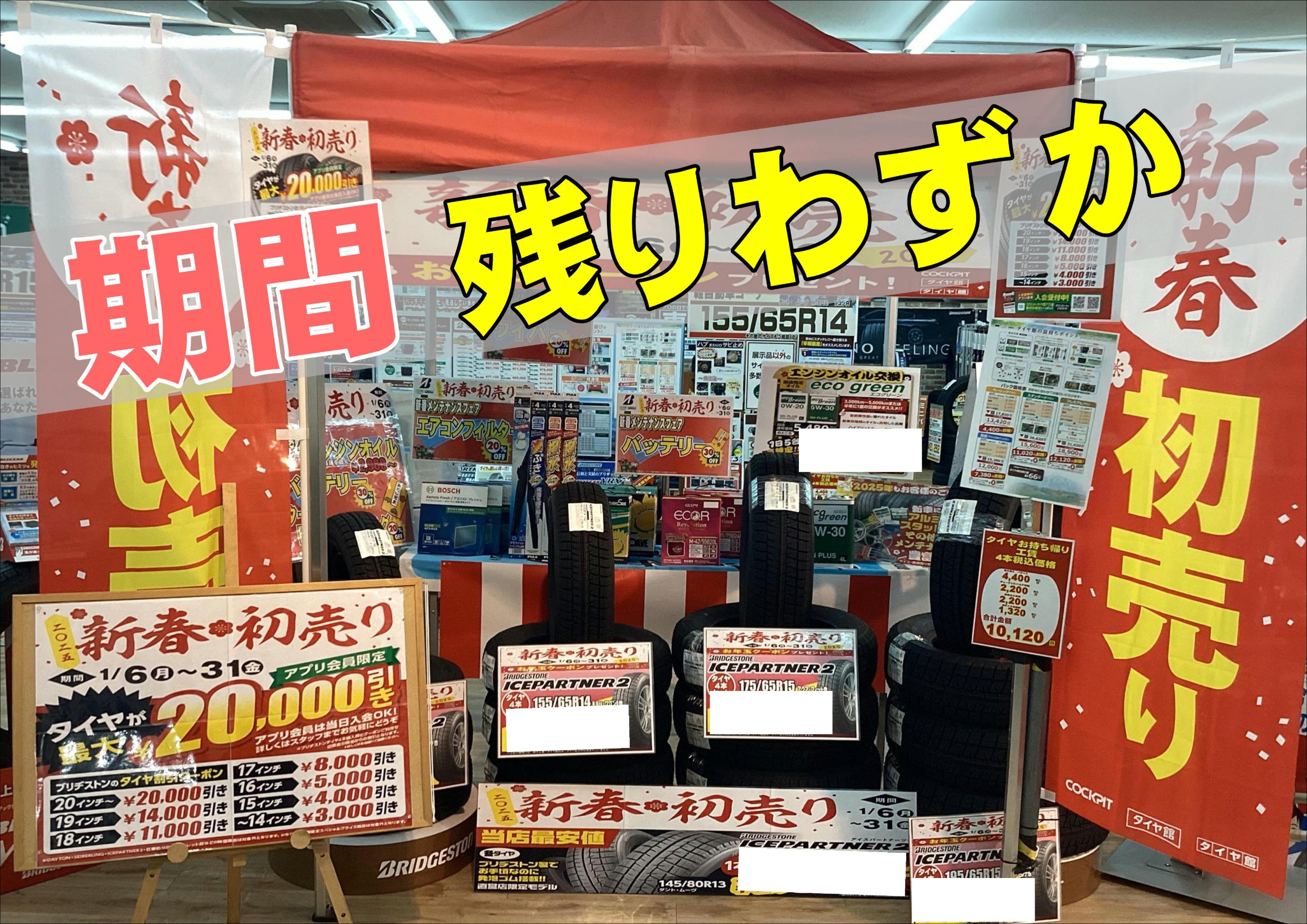 もう少しで終了です! ポスト 2025年1月26日 こんにちは!店長の大津です! サムネイルにある通り、初売りセール期間、残り僅かです!!! 1/31まで開催です♪♪ タイヤだけではありません!オイルやバッテリー、ワイパー他も 新春セール価格となっております!!! これを機会にお車のメンテナンスを行いませんか?? 話は変わりますが、キャンプメーカーでおなじみDODさんの商品が当店でも 販売できるようになります!! 自称キャンパーの私にはとても嬉しいです。 販売開始期間はまだ少し先ですがまた、こちらでご報告致しますね(^^)/