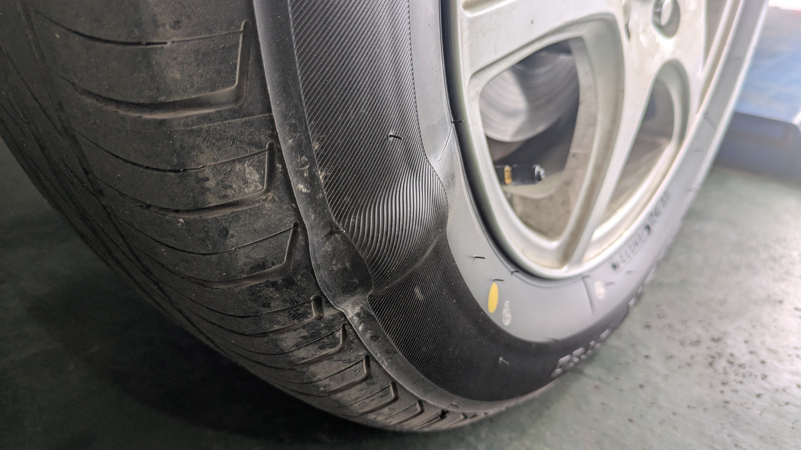 お使いのタイヤこのようになっていませんか?? ポスト 2025年4月20日 縁石ぶつけてタイヤのサイド部が損傷している写真です。 たんこぶの様にぷっくりと腫れあがったタイヤのサイド部。 内部で損傷をしている為ゴムだけで内圧・車重を支えている状態。 大変危険です。 いつ、どこで破裂するか分かりません。 サイド部は非常に繊細は場所です。こうなると修理不能なため交換することに。 沢山ある路面の穴ぼこに落ちてこのようになるケースも少なくはありません。 定期的な点検で早期発見し安全にドライブしましょう!!