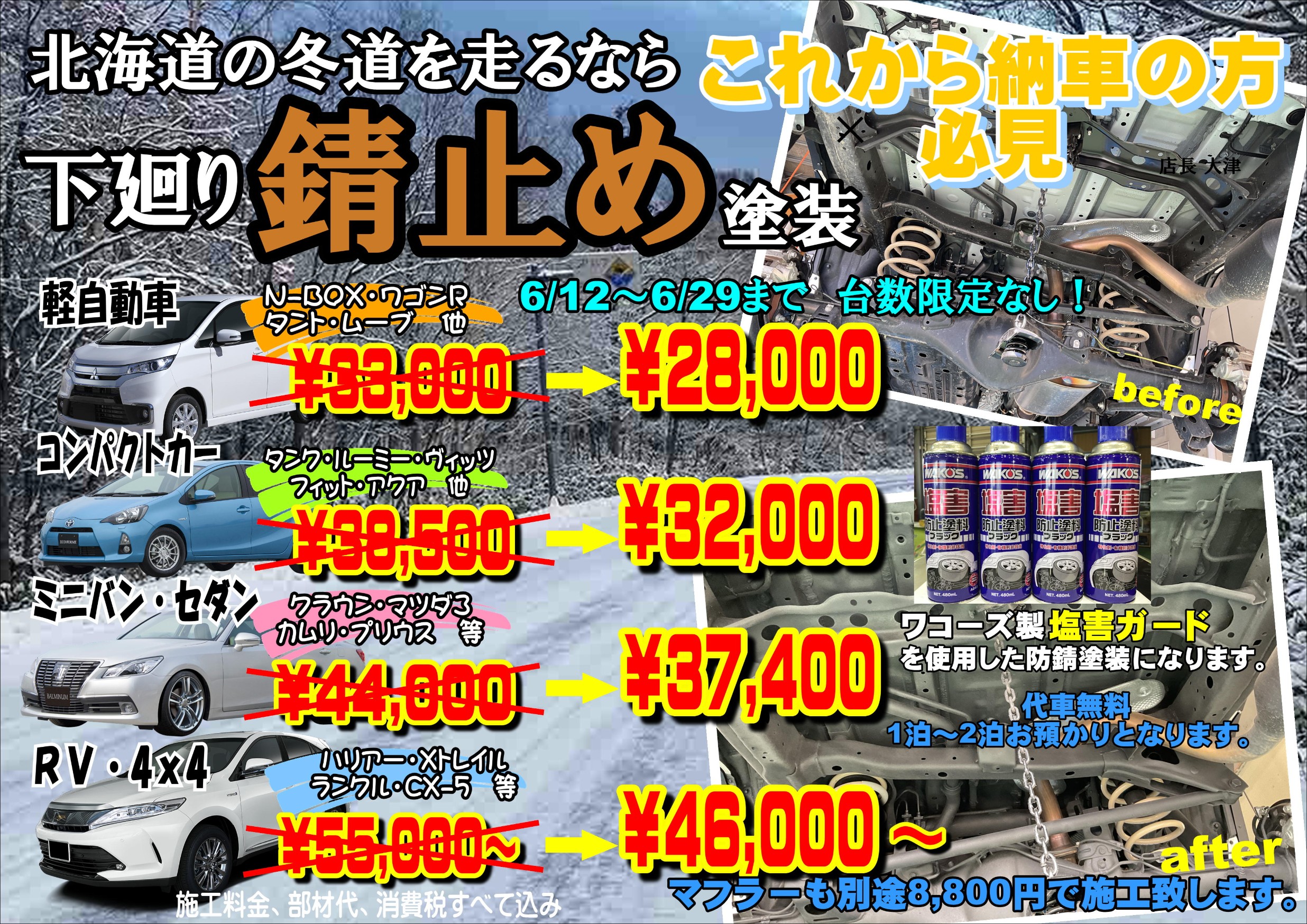サビ止め キャンペーン開催 早速施工しました! ポスト 2025年6月13日 今回の施工車両は「マツダCX-30」です♪♪ 新車納車間もないお車でした♪♪ こちらの車両はアンダーカバーが取付されているため大部分を取外してからの施工と なりました。 ※その際は別途アンダーカバー脱着料金がかかります。 4,400円税込~ 枚数によって異なります。 ワコーズ塩害ガードでの施工をご依頼頂きましたm(__)m とても綺麗に施工でき大変ご満足頂けました♪♪ 有難う御座います♪♪ キャンペーン残り日数まだまだあります!! どしどしご相談くださいm(__)m