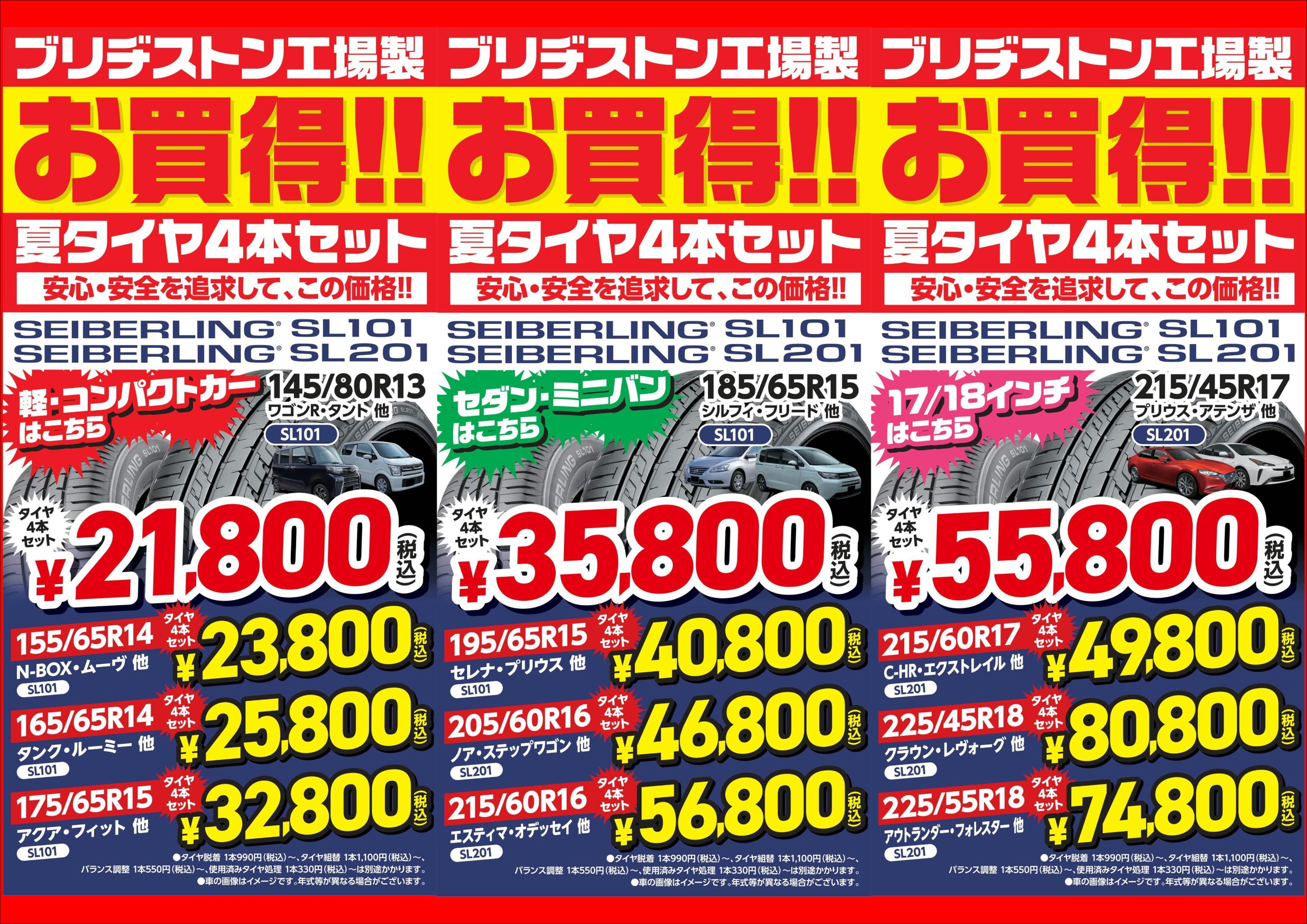 お買い得夏タイヤあります♪♪ ポスト 2025年7月11日 夏タイヤご検討中の方必見です! 夏の熱い路面を走るタイヤには大きな負担がかかっています。 「溝の少なくなったタイヤ」 「ヒビの入ったタイヤ」 危険な状態で走行していませんか? ご検討中の方は、是非当店も見に来て下さい! ブリヂストンだから高いのしかない・・・ そんなことはありません!! チラシの様に「ブリヂストン製」の一部輸入のタイヤもあります! 一度見積だけでもいいので足を運んで頂きたいです。