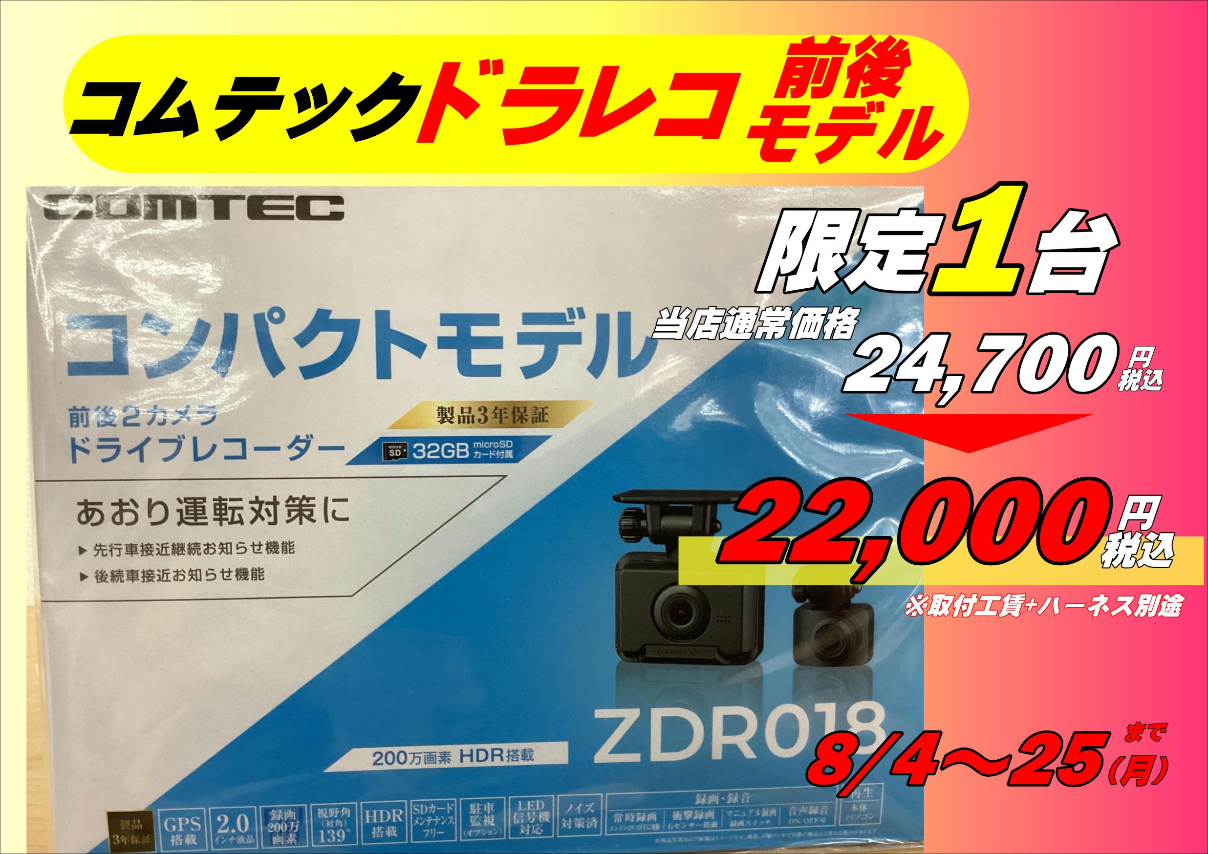 ドライブレコーダーキャンペーン開催中!! ポスト 2025年8月4日 行楽シーズン、お車でお出かけされる機会が多いと思います♪♪ ドライブレコーダーは取付してありますか?? 万が一の事故の時に大変役に立つと思います!! 当店では価格面でお手伝いできればと思いまして、キャンペーン開催致します!! ユピテル SN-TW9990d コムテック ZDR018 こちらの2台を数量限定で販売致します!! 期間は8/4(月)~8/25(月)まで この機会をお見逃しなく♪♪ タイヤ館 275 住所:007-0827北海道札幌市東区東雁来7条1丁目16ー1 電話番号: 011-782-5837 カテゴリ:その他カー用品関連