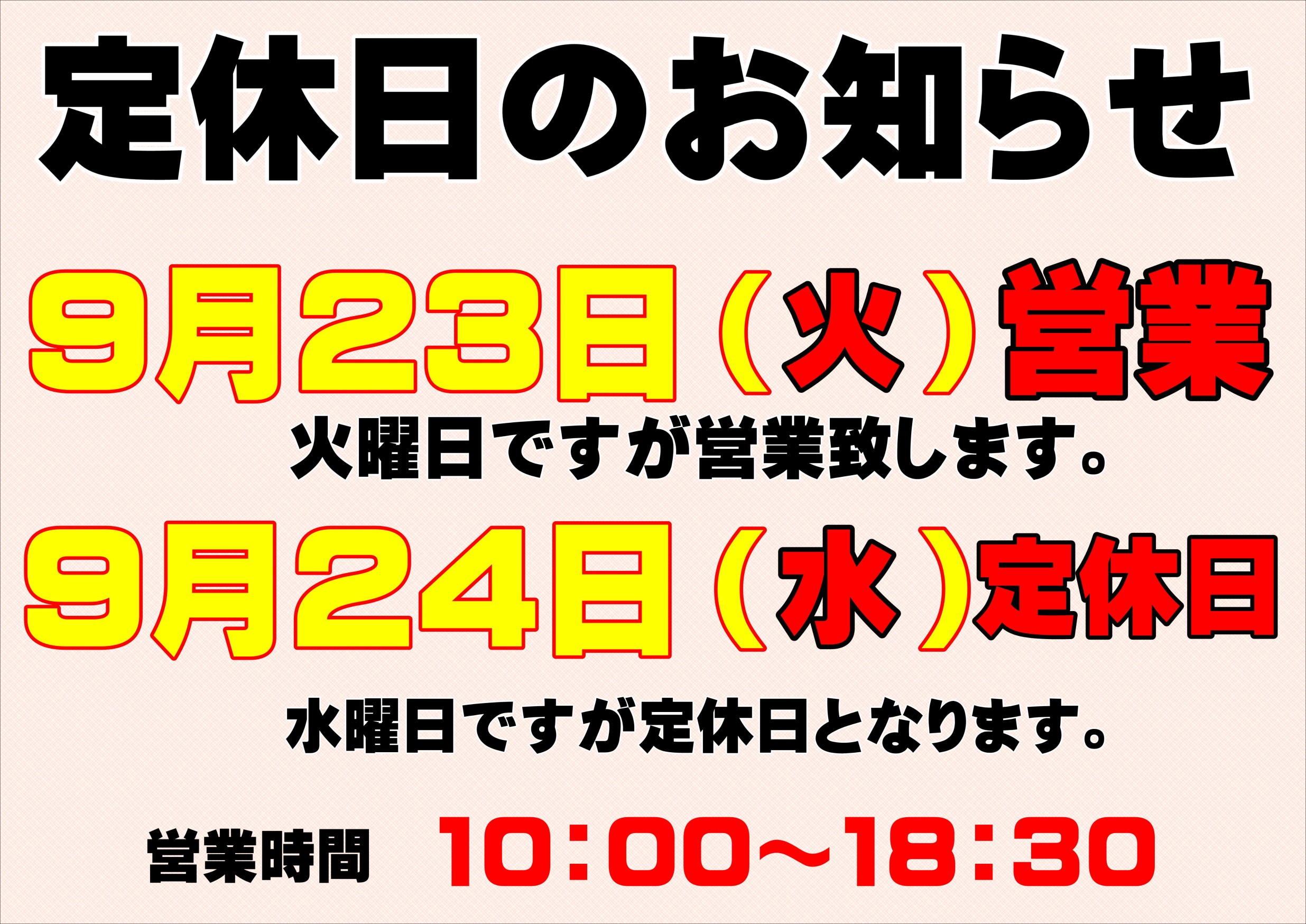 定休日のご案内 ポスト 2025年9月22日 いつも当店をご利用頂きまして、誠に有難う御座います。 定休日のご案内です。 通常火曜日を定休日とさせて頂いておりますが、 9月23日(火)は営業日となります。 翌日9月24日(水)が定休日となります。 以降は通常どおりの火曜日が定休日です。 イレギュラーな形になりますが、何卒宜しくお願い申し上げます。 担当:店長