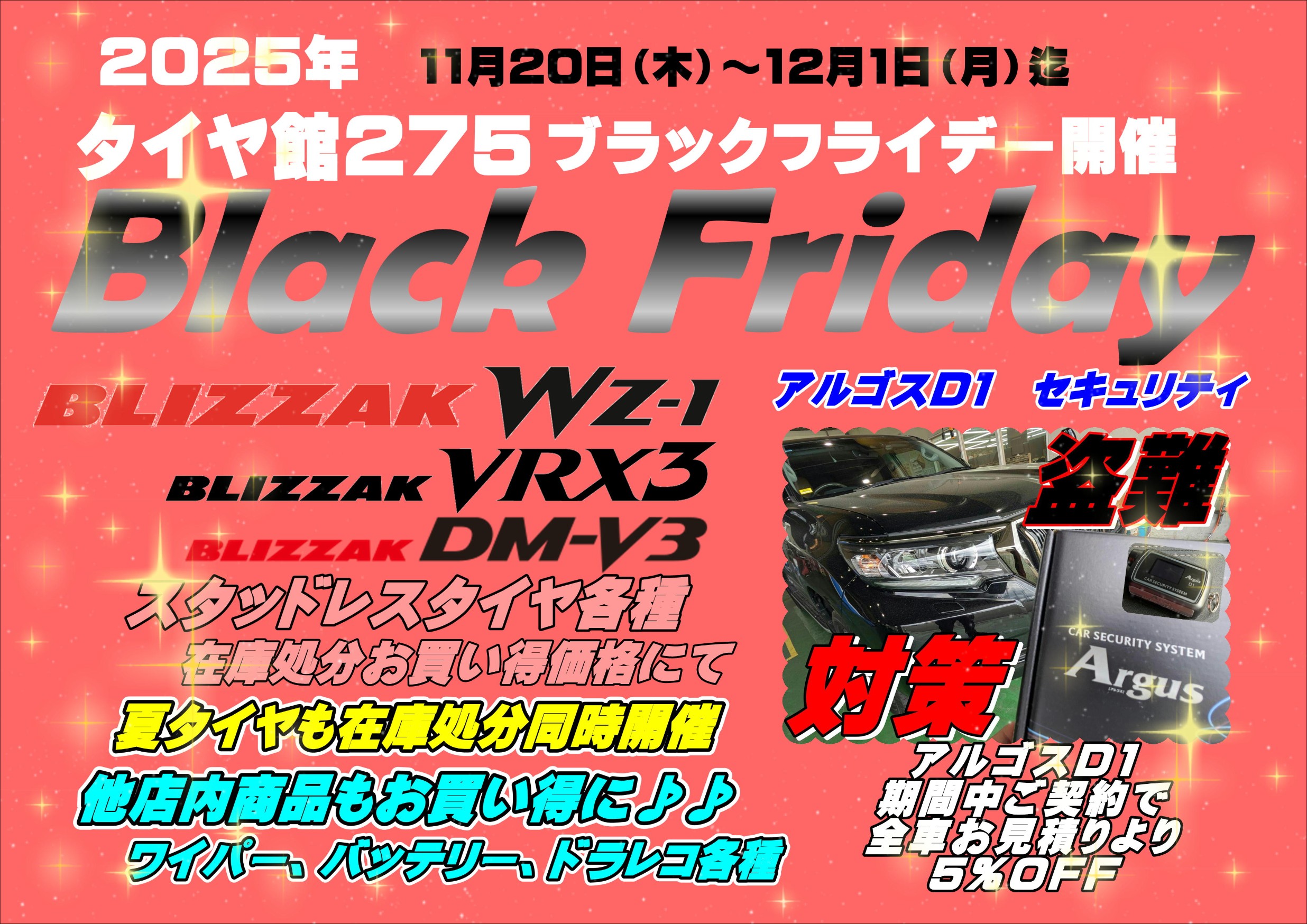 大好評!! ポスト 2025年12月1日 12月取付分の「アルゴスD1」 続々と入荷しています♪♪ ご注文頂きまして誠に有難う御座います!! まだまだどしどし取付受付中です♪♪ お買い求めやすい「ブラックフライデー」も本日12/1が最終日!! お見逃しのないようにお願い致します!! タイヤ館 275 住所:007-0827北海道札幌市東区東雁来7条1丁目16ー1 電話番号: 011-782-5837 相談予約