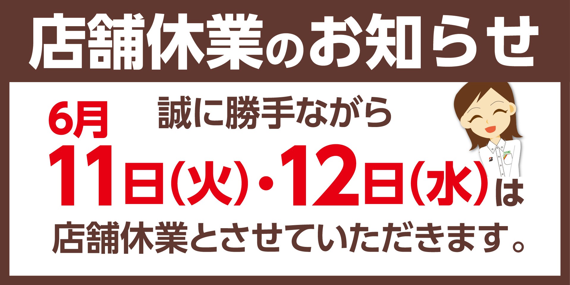 店舗休業のお知らせです ポスト 2019年6月3日 いつも当店をご利用頂きまして、誠にありがとうございます。 誠に勝手ながら6/11(火)~6/12(水)は休業日とさせて頂きます。 お客様にはご不便をお掛け致しますが、 何卒ご理解賜ります様お願い申し上げます。