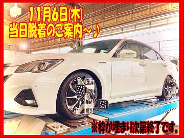 11/6(木)の予約外当日枠のご案内です!本日もおかげさまで脱着予約でいっぱいとなっておりますが、車をお預かりして終わり次第お電話という形であれば、数台当日枠として(脱着orオイル交換など)お受けできる場合がございます。 なお、本日の当日台数に達しましたらお受けできない場合があります。 ...
