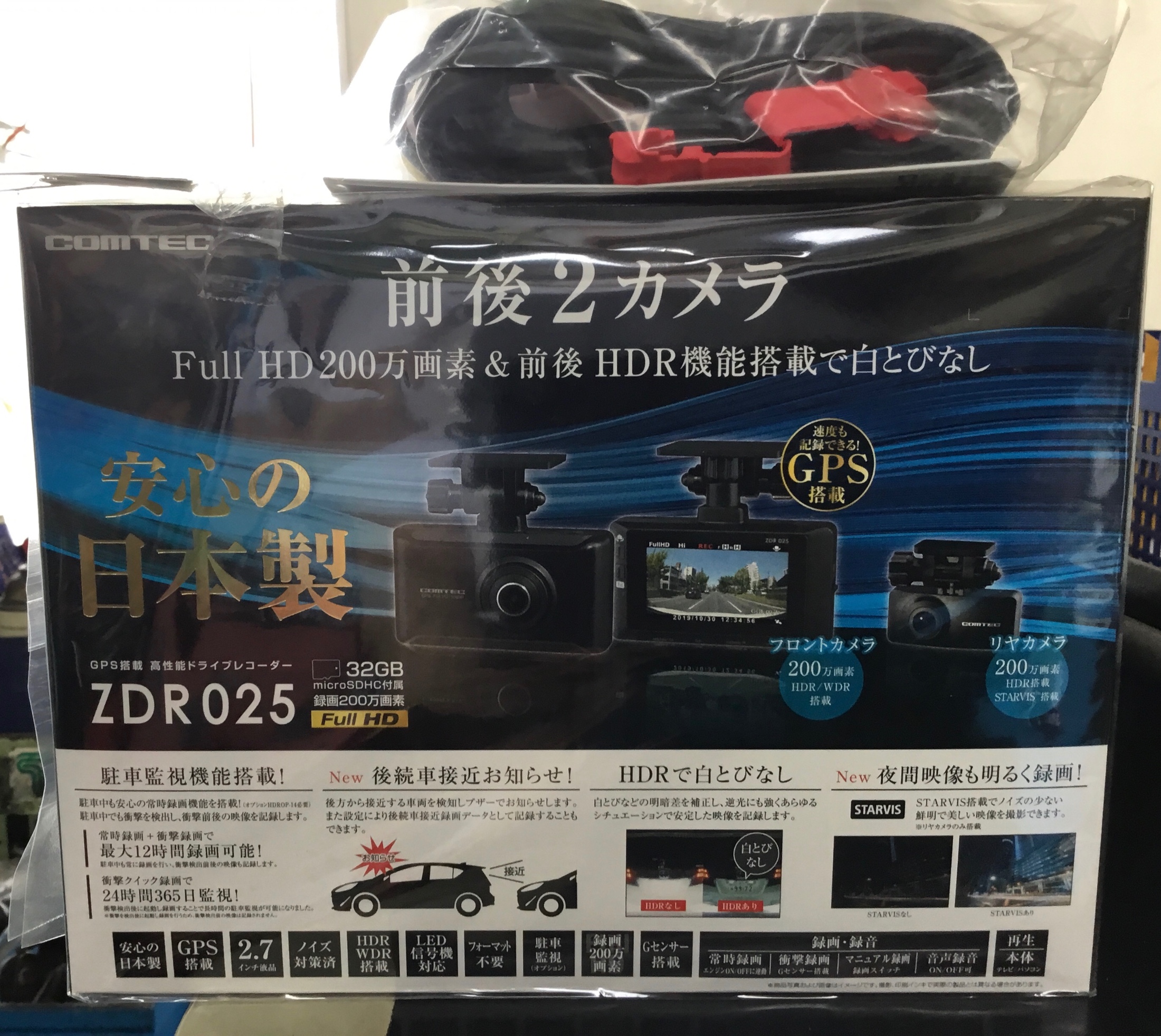 取付た機種は当店人気No.1、コムテック製前後2カメラ『ZDR025』になります。
