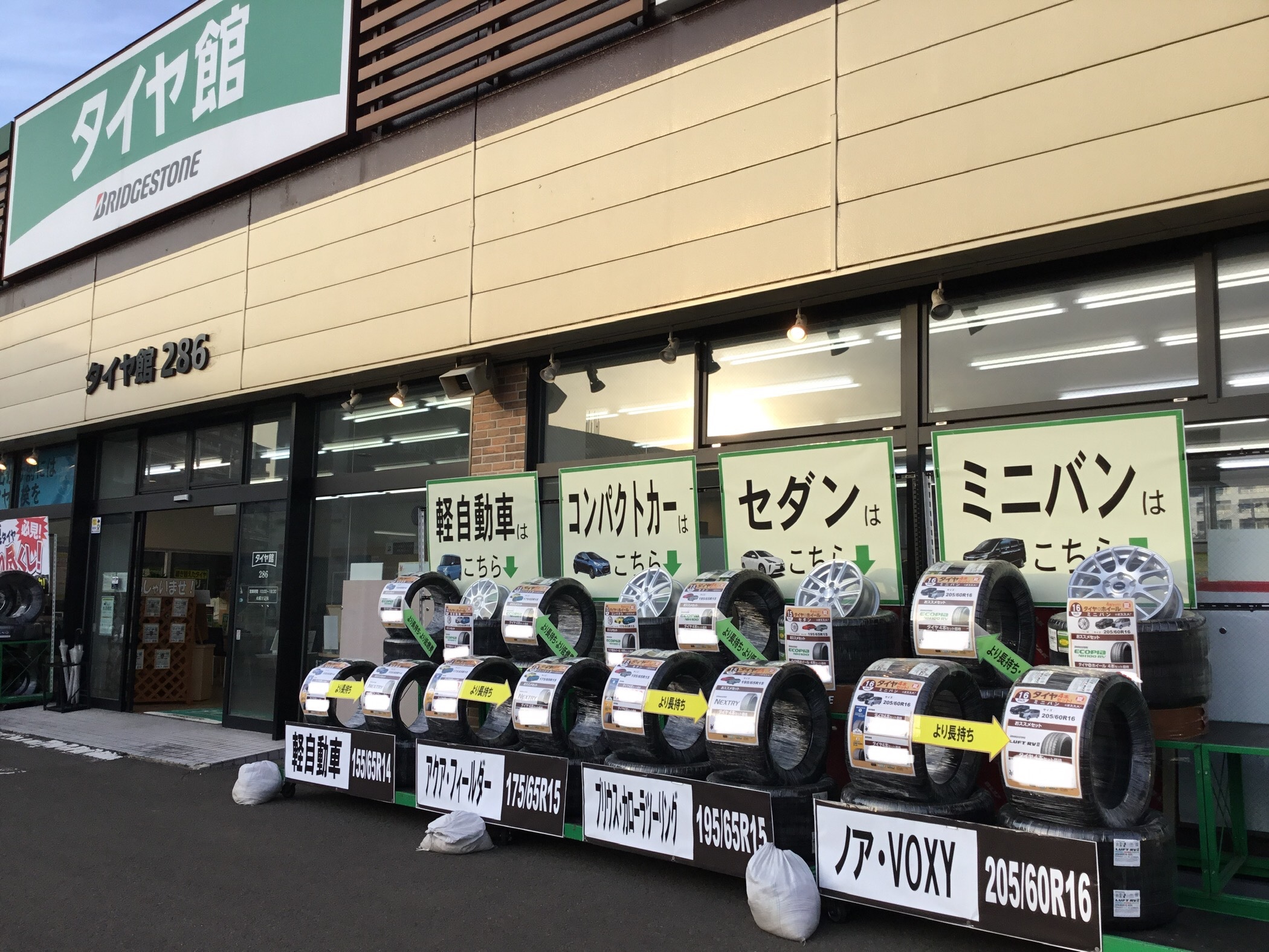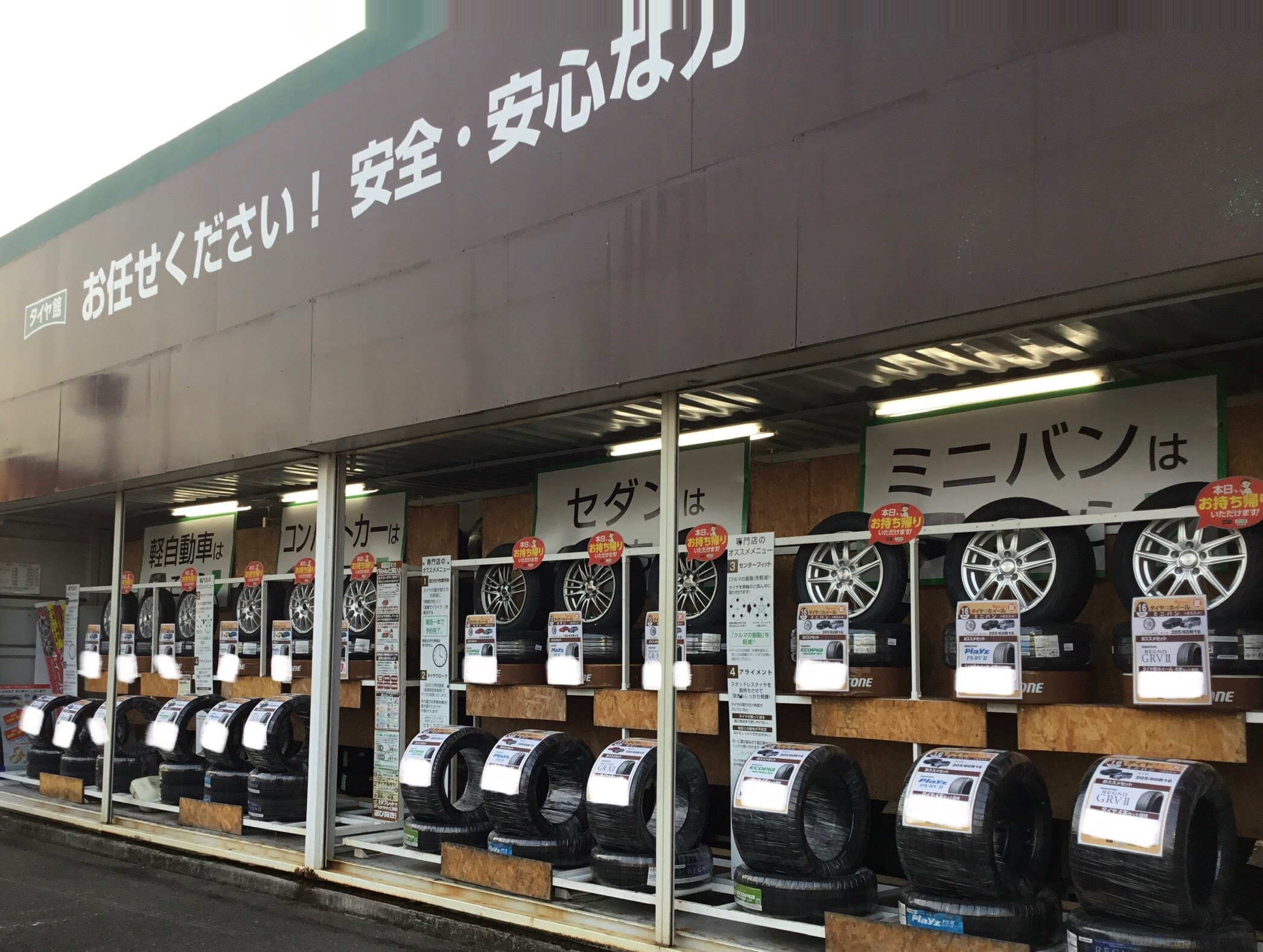外のコンテナと店頭展示、店内展示も冬タイヤから夏タイヤへ