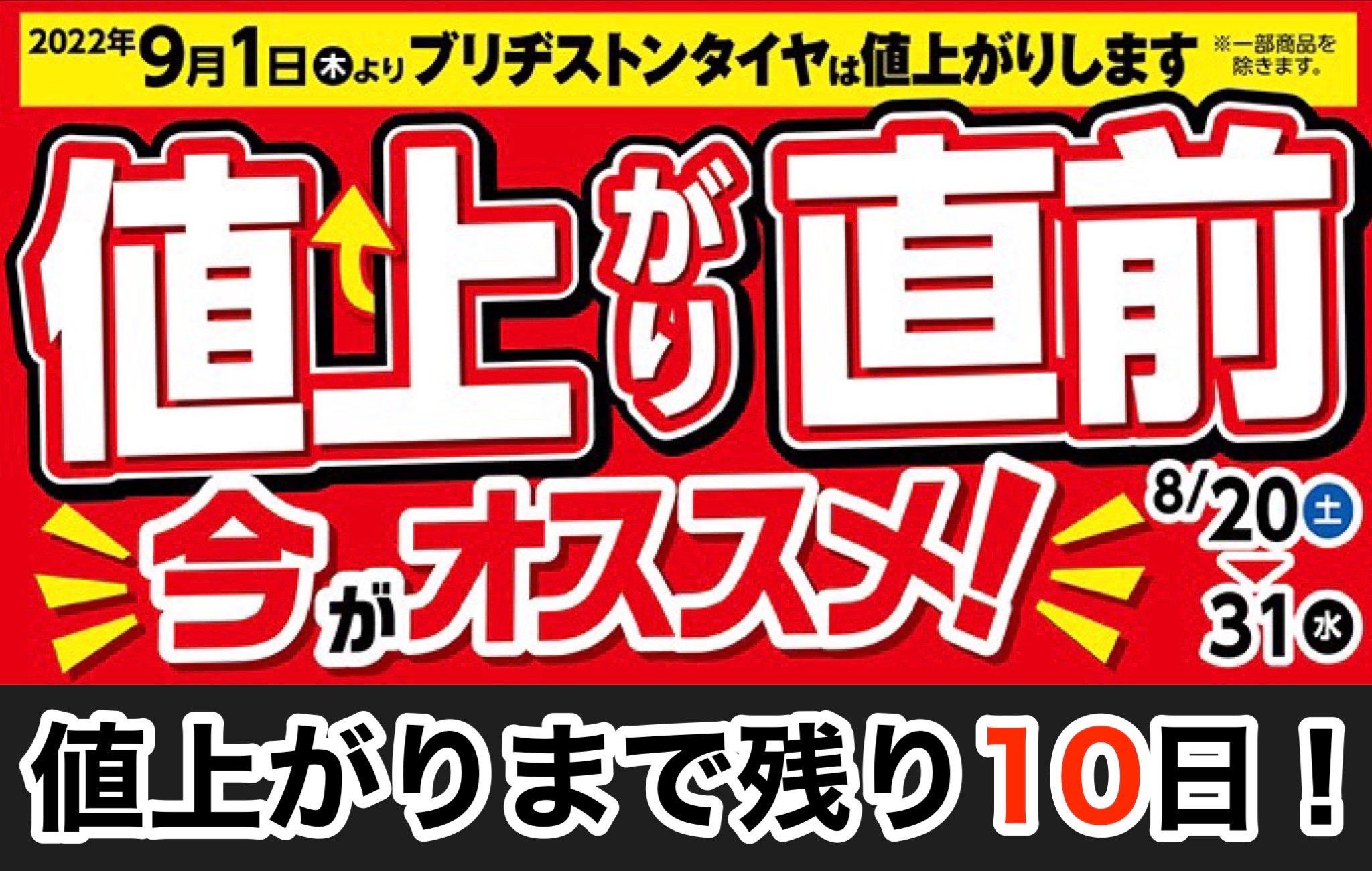 9月1日(木)よりブリヂストンの国内市販用タイヤが値上がりします。