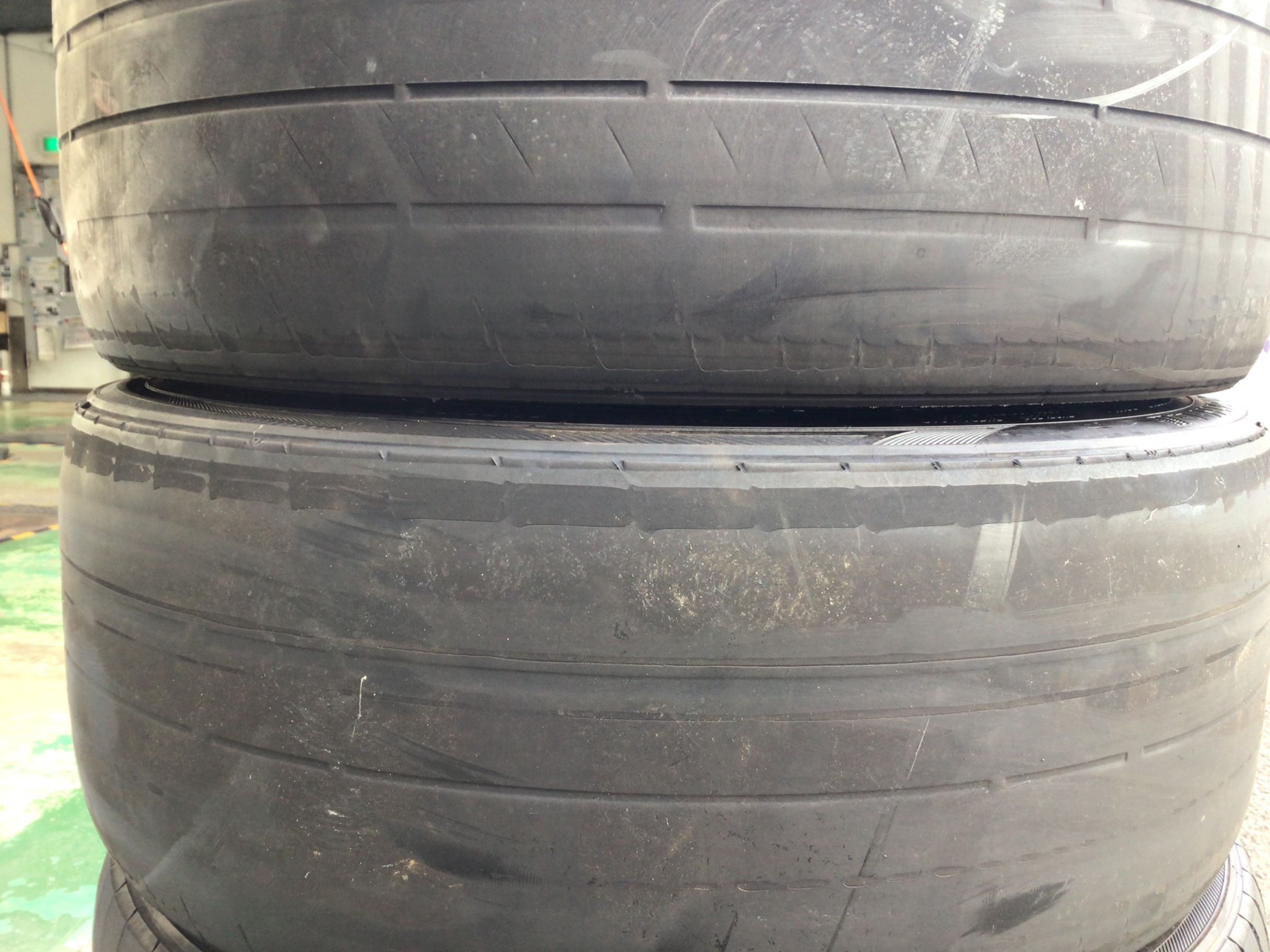 こちらのタイヤ。足回りの不具合で溝がなくなっています。お客様も値上げ前に交換しておこうと当店にご来店いただきました。