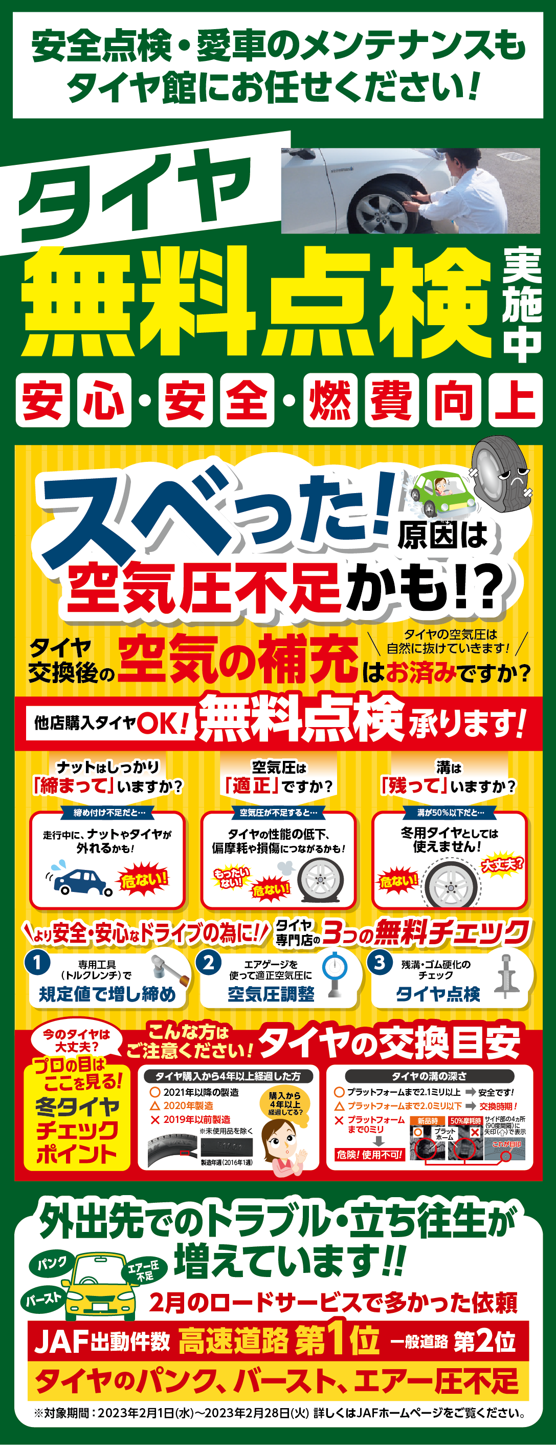 当店では定期的にタイヤの残り溝、空気圧、ナットの増し締めの点検を無料で実施しています。その際にタイヤの状況も一緒に確認し、お客様が安心安全にお車を乗っていただけるようにサポート致します。是非お気軽にお越しください!!