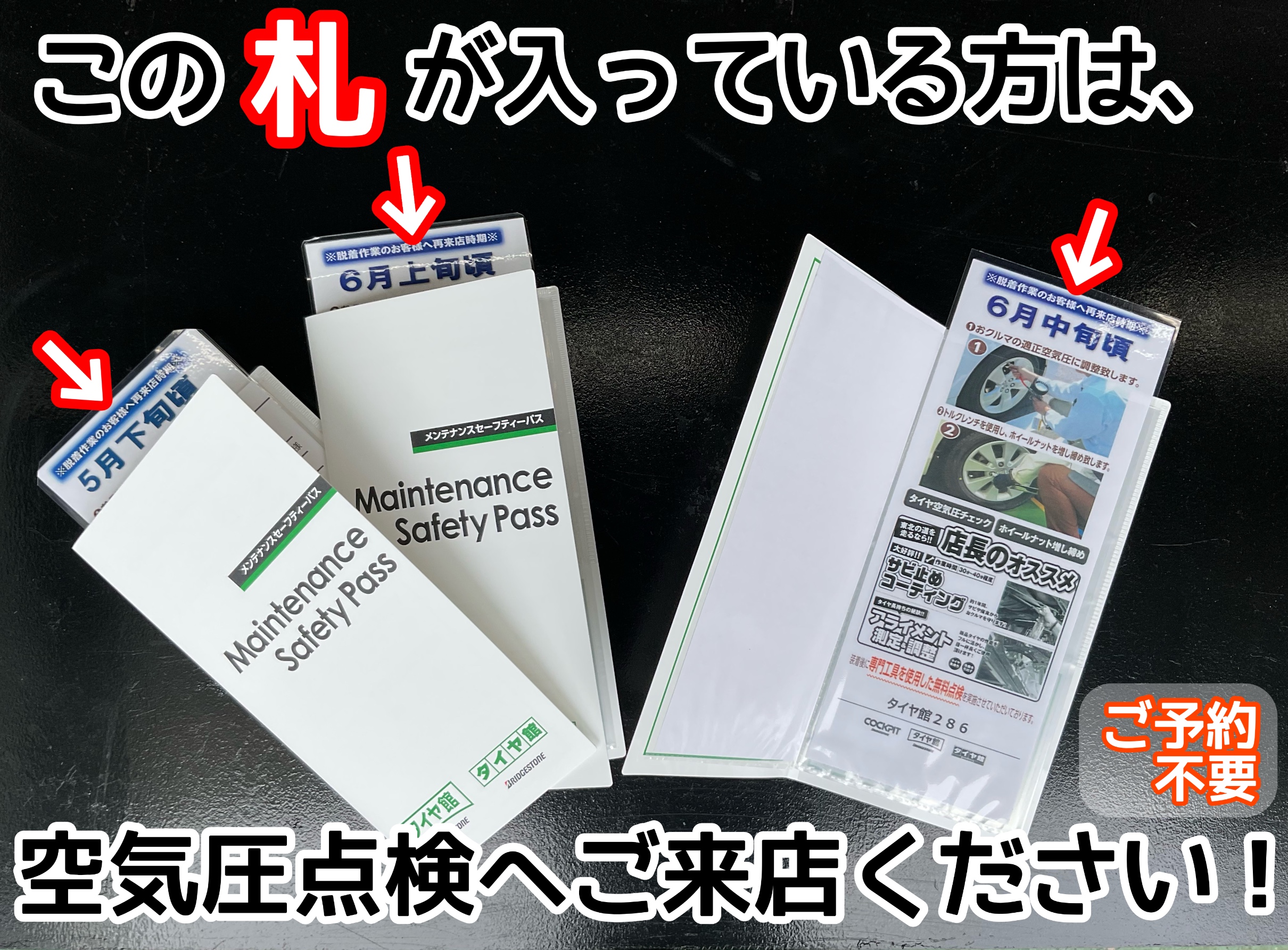 当店でタイヤ交換された方で整備記録手帳にこの札が入っている方は、ぜひ一度空気圧点検にお越しください!