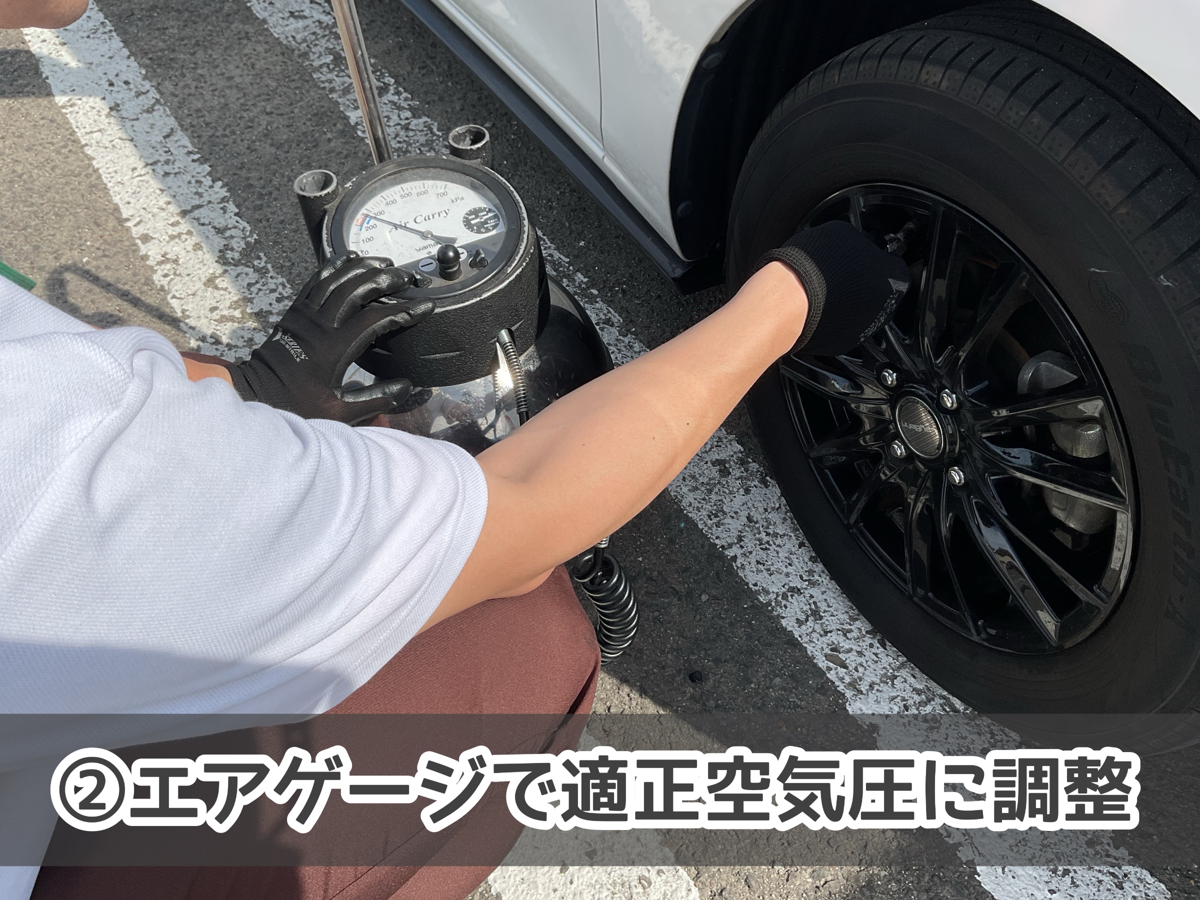 タイヤの空気圧をおクルマの適正空気圧に調整いたします。