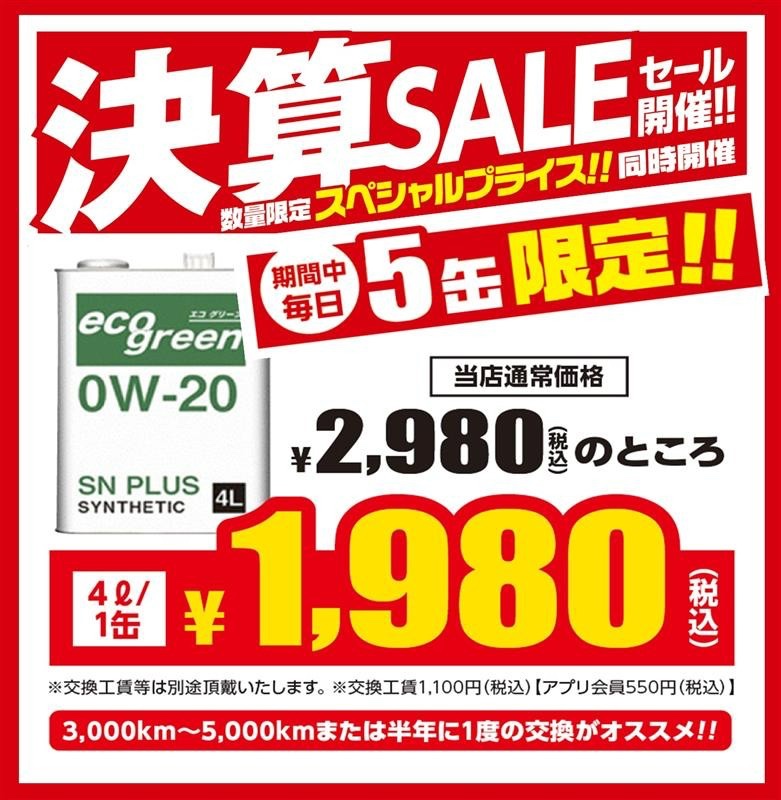 【エンジンオイル】決算セール期間限定!数量限定!エコグリーン0W-20、5W-30