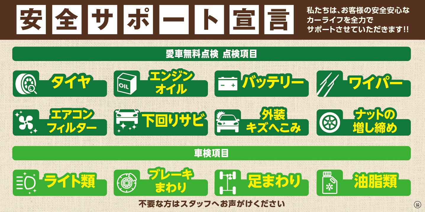 【全車点検実施中】安全サポート宣言 ポスト 2025年11月14日 いつも当店をご利用いただきありがとうございます 当店では冬のカーライフの安全安心をサポートするために全車安全点検実施「安全サポート宣言」を実施中! タイヤ・ライト周り・オイル・バッテリー・ワイパーなど基本かつ重要な部分はもちろん、 下回りのサビなどクルマ長持ちに関する項目も無料点検いたします! コクピット・タイヤ館アプリがあれば点検結果や次回来店目安をいつでも確認できます! お得なクーポンや情報も発信中!ご予約もアプリで簡単!ぜひダウンロードしてくださいね!
