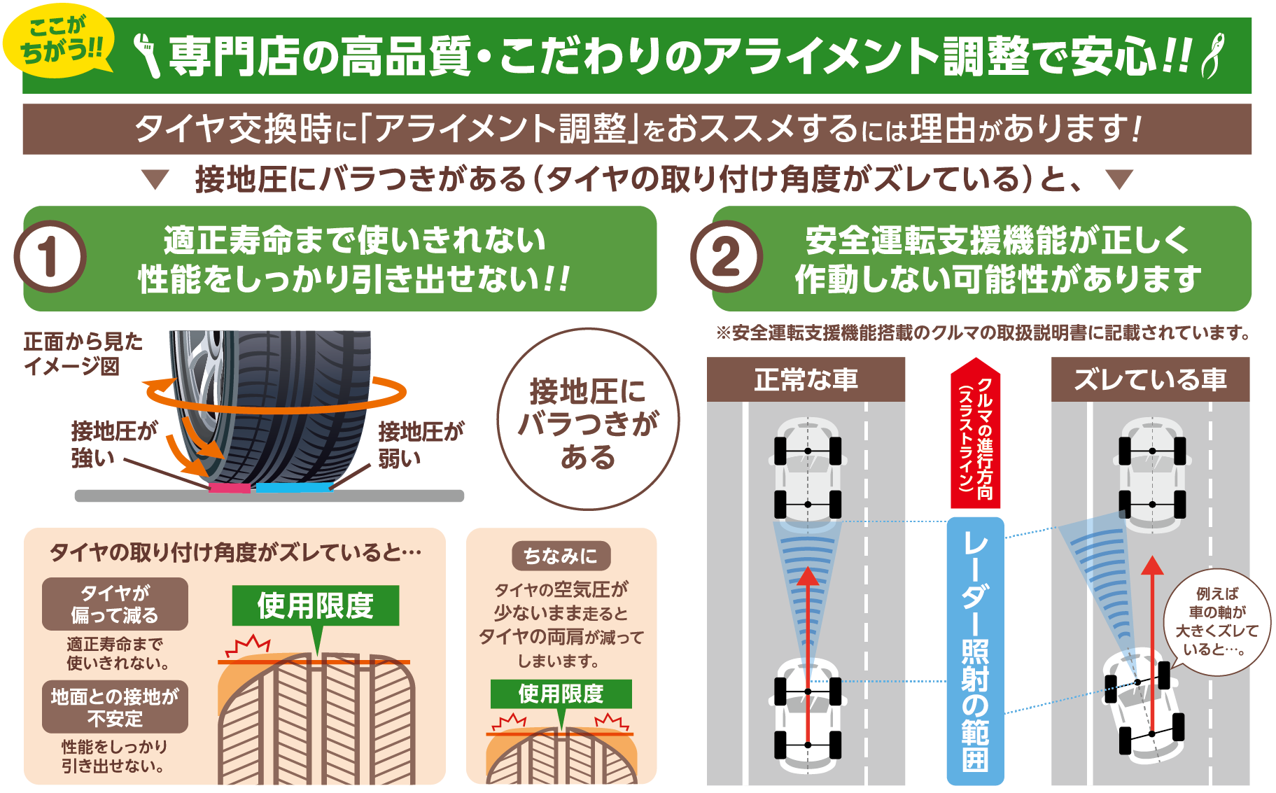 アライメント調整を定期的にすることでタイヤの溝を成るべく均等に使用することができ、長持ちへと繋がります。